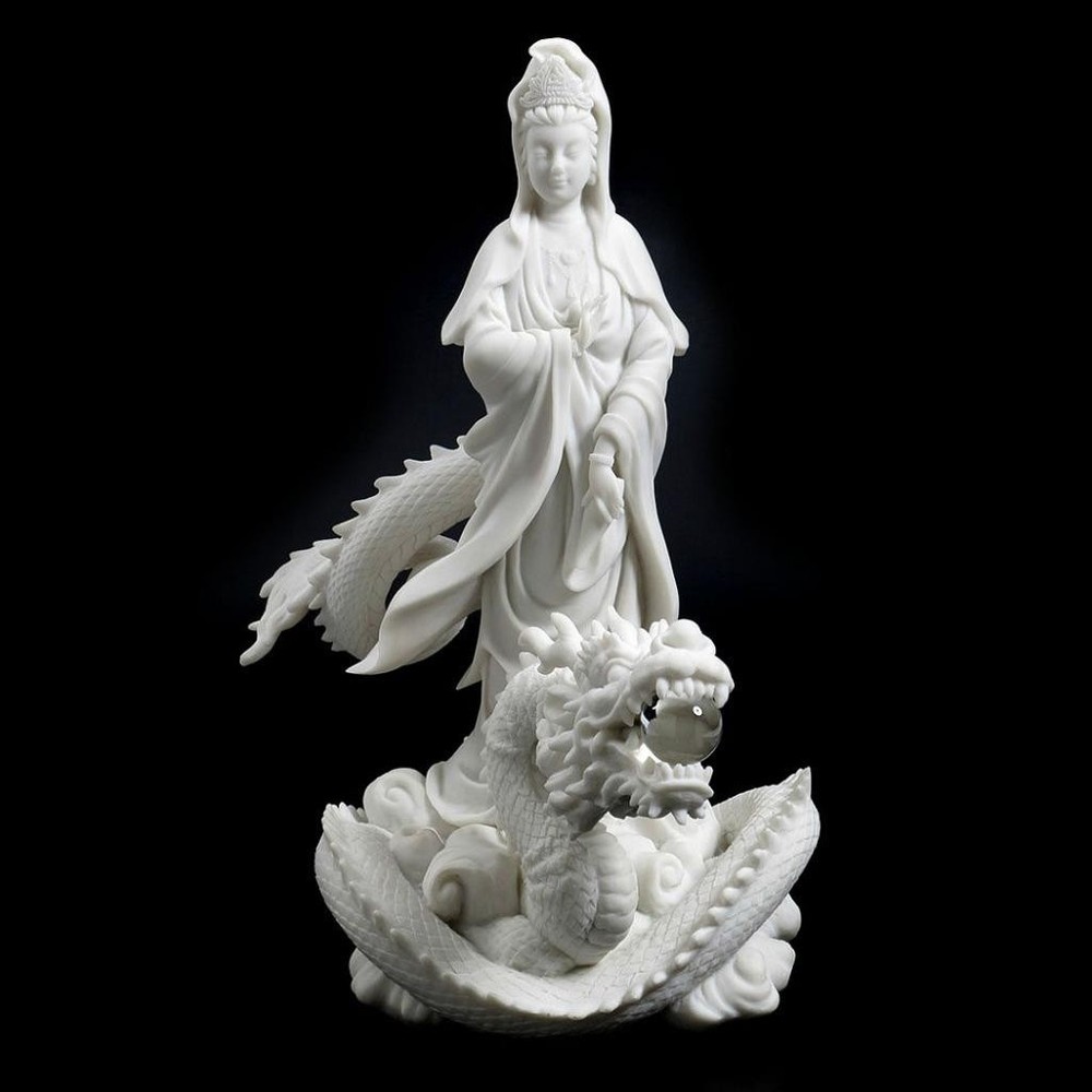 Kwan Yin on Dragon Statue Kwan Yin on Dragon Statue Click image to enlarge Description This beautiful statue is made from resin with crushed marble powder. It has exceptional detail and craftsmanship , and it is substantial with good weight. Detail Condition: Brand New Design: Kwan Yin on Dragon Material: Resin with Crushed Marble Powder Color: White Size: Approx. 12.5" x 7" x 10.5" Weight: Approx. 4 lbs Kwan Yin Pu Sa is the Buddhist Bodhisattva of compassion and mercy. Her name translates to 'she who hears the cries of the world'. She is beloved and worshiped in Buddhist communities worldwide for her unconditional love of humanity. Here she is seen riding upon a dragon as the 'Bodhisattva of the Southern Sea' and patroness of fisherman. SEE OUR ENTIRE SELECTION OF BEAUTIFUL KWAN YIN STATUES IN THE KWAN YIN SECTION OF OUR STORE. Shipping Shipping charges calculated to location. International Buyers International shipping charges are calculated to location in the 'Shipping and Payments' tab near the top of this page. Import duties, taxes, and charges are not included in the item price or shipping cost. These charges are the buyer's responsibility. Please check with your country's customs office to determine what these additional costs will be prior to bidding or buying. 'International First Class Mail' can take up to 6 business weeks for delivery depending on destination country, destination customs, and local or origin peak holiday shipping season. Faster 'International Priority Mail' shipping options are also available at checkout for most items. About Us The Tiny Dragon is a U.S. owned and operated 'e-retail' company. Our mission is to provide unique and affordable items of quality, promptly delivered to your complete satisfaction. Our items are shipped directly to you from our headquarters in beautiful Portland, Oregon USA. View our entire inventory at: At 'The Tiny Dragon' you are a valued customer and it is always our pleasure to serve you.