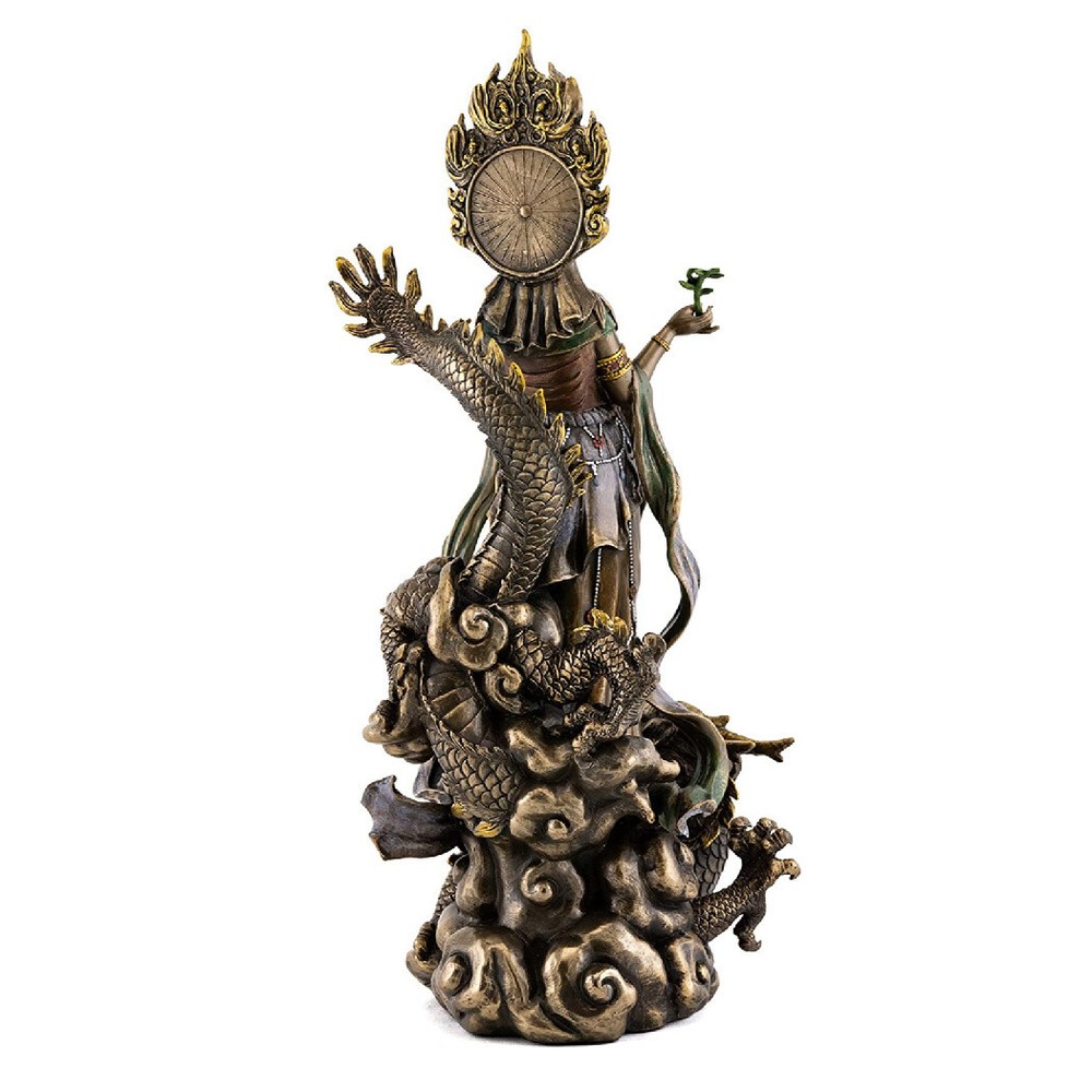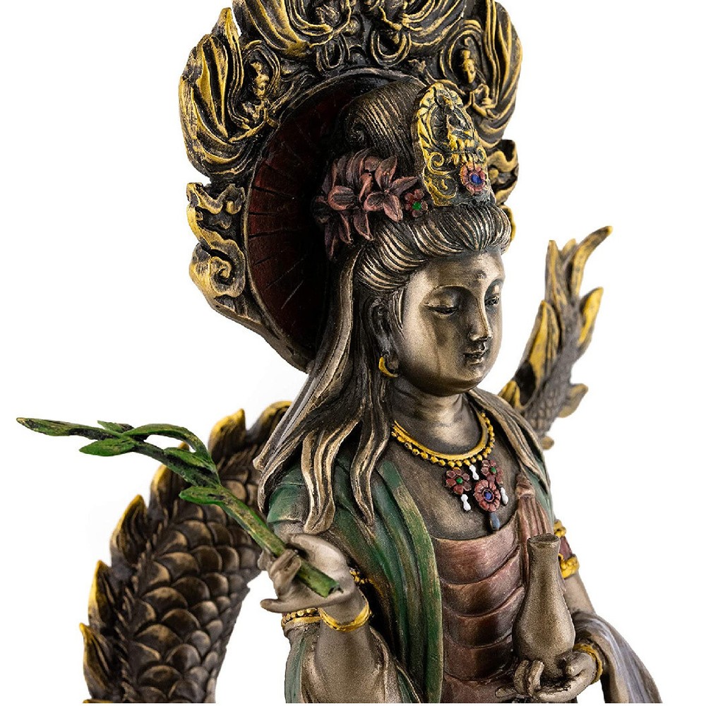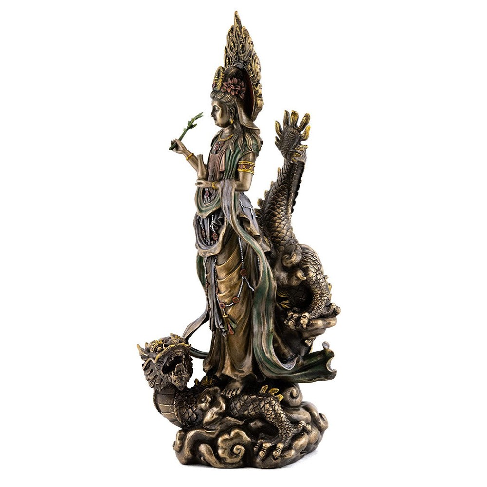 Kwan Yin on Dragon Statue Kwan Yin on Dragon Statue Click image to enlarge Description This is a cold cast resin statue of Kwan Yin - the Buddhist goddess of compassion and mercy - that is beautifully plated with bronze. It has exceptional detail and craftsmanship and is substantial with good weight. Details Condition: Brand New Design: Kwan Yin on Dragon Material: Resin & Bronze Plate Overall Size: Approx. 14" x 6" x 6" Size at Base: Approx. 4.5" x 4" Item Weight: 5 lbs, 4 oz Kwan Yin is beloved and worshiped in Buddhist communities worldwide for her unconditional love of humanity. Here she is seen riding upon a dragon as the 'Bodhisattva of the Southern Sea' and patroness of fisherman. SEE OUR ENTIRE SELECTION OF BEAUTIFUL KWAN YIN STATUES IN THE KWAN YIN SECTION OF OUR STORE. Shipping Shipping charges calculated to location. International Buyers International shipping charges are calculated to location in the 'Shipping and Payments' tab near the top of this page. Import duties, taxes, and charges are not included in the item price or shipping cost. These charges are the buyer's responsibility. Please check with your country's customs office to determine what these additional costs will be prior to bidding or buying. 'International First Class Mail' can take up to 6 business weeks for delivery depending on destination country, destination customs, and local or origin peak holiday shipping season. Faster 'International Priority Mail' shipping options are also available at checkout for most items. About Us The Tiny Dragon is a U.S. owned and operated 'e-retail' company. Our mission is to provide unique and affordable items of quality, promptly delivered to your complete satisfaction. Our items are shipped directly to you from our headquarters in beautiful Portland, Oregon USA. View our entire inventory at: At 'The Tiny Dragon' you are a valued customer and it is always our pleasure to serve you.