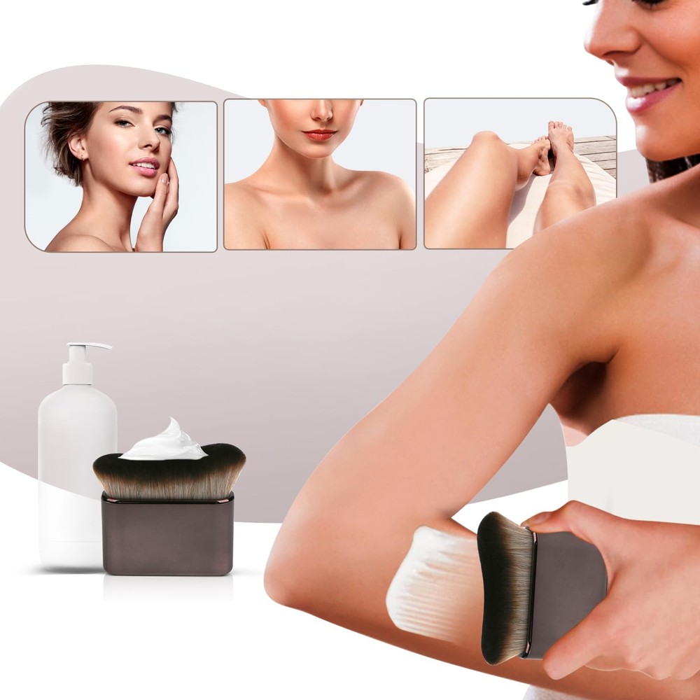 UNIMEIX Self Tanner Brush Sunscreen Body Makeup Brush Kabuki Blend Applicator Spray Tan Blending Beauty Brush for Body Coverage Perfector (Gray) BRONZER BRUSH & SELF TANNING BRUSH - This bronzer brush is made of ultra-fine soft high-density synthetic bristles and a shiny ABS handle. The handle is easy to hold, so you don't have to worry about the body brush falling and getting dirty during use. DENSE BRISTLES - With over 20,000 soft and dense bristles, the self tanner brush is durable, flexible, and prevents shedding, which can reduce the absorption of tanning lotion, easy to clean, and maintains good shape and structure after long-term use. PERFECT FOR FACE AND BODY MAKEUP - This body makeup brush can apply any type of tanning product/makeup, such as foundation, powder, liquid powder, concealer, cream, blush, contour and body glitter, quickly and accurately create a natural makeup. NO-MARK TANNING - The tanning brush is designed to fit the curves of your legs, arms and body. The unique curves and bristles provide perfect coverage, helping you quickly apply tanning products to your face or back without leaving any marks. In just 10 seconds, you can create a smooth, natural and flawless natural bronze complexion. MULTI-PURPOSE - The self tanning brush can be used alone as a makeup brush, or with mittens and tanning gloves, perfect for applying tanning cream to the body , tanning, leg makeup and perfect concealer.