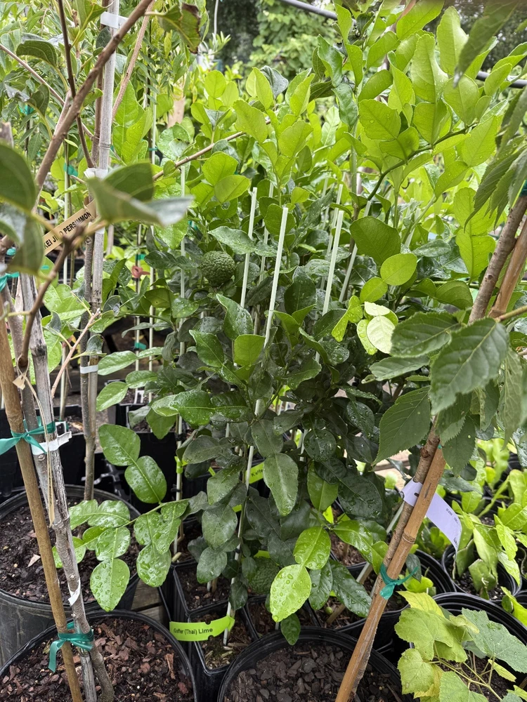 *** We ship this plant to the West Coast only during this time due to the cold weather. **** *** We do not ship this plant to FL due to the state regulations. *** Grown in a 4" x 12" or 5" x 12" pot, Primo size. Full-size, large edible leaves, and fruits; Fruit, rind, juice, and leaves are used in Thai, Laotian, Malaysian, and Cambodian cooking. Cut leaves in summer and store them in the freezer for your cooking all year round. Grafted semi-dwarf Thai Kaffir Lime tree is good for containers. They can be planted in the ground in zones 9-10. It should be the container plant for the other zones. Keep them outdoors from late May to October for the colder zones and put them indoors when the temperature is less than 40 degrees. 24" to 36" + trees, Pictures for reference only. The example of trees we currently ship as of July 2025 are shown in the pictures. Each plant is different in shape and size. Fragrant plants, and dark green leaves, smell good in delicious meals, and in your house. Some trees are fruiting Picture and content credit - itsnature.org The kaffir lime (Citrus Hystrix) is a rough, warty green fruit that has an exotic aroma and it is famously known for its double-shaped leaves, and both the fruit and its leaves are used for cooking to increase the scent of dishes. The leaves of this fruit are egg-shaped and its color is dark green on top but lighter green at the bottom. Kaffir limes have a lot of health benefits and are used to do more than just cooking. Some would opt to use kaffir lime for medicinal purposes. There are also cultures in certain countries that use the fruit for spiritual purposes. Kaffir lime can be found in Laos, Indonesia, Thailand, and Malaysia, and thus, they are mainly used in South-East Asian cuisines. In Thailand, the kaffir lime leaves are widely famous when cooking their famous delicacy dishes. Thai cooking uses leaves in Tom Kha (soup), Tom Yum (soup), Todman (shrimp or fish cake), Panang (curry), Chiang Mai Noddle, Chicken Satay, Prik-Khing curry, and some other curry dishes and hot-spicy stir-fried. It is also mainly used in Lao curry pastes and Malaysian and Burmese cuisines. The fruit and the leaves both bring out more zest into any cuisine and increase the scent as well. Many use the kaffir lime for spicy dishes as the taste and the smell could complement perfectly with spicy foods. Generally, kaffir lime contains many nutrition and health benefits. It contains tannin, triterpenoids, and saponin which are good for skin growth especially the leaves. Some use them for hair treatment and treatment for hair follicles. Combining with normal shampoo, people would just lather up their hair and massage their scalp in order for the lime extract would seep through the skin and repair the hair scalp which ultimately would cure the root of each strand of hair which will appear much shinier and healthier. The kaffir lime also cures coldness and lethargic and its bitter taste too can help with blood circulation.