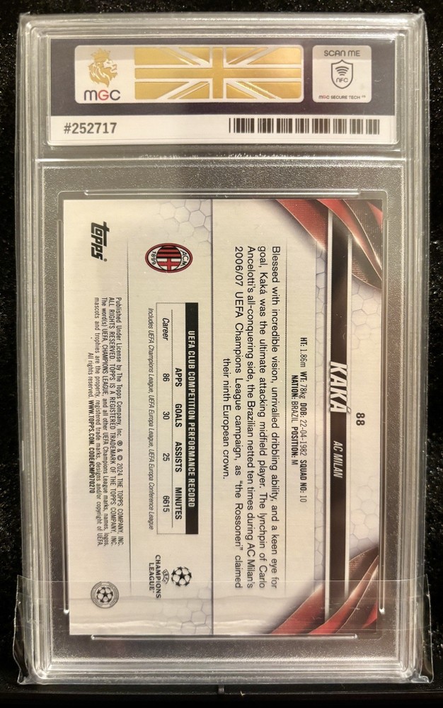 The product is a highly sought-after Kaka trading card from the 2023-24 Topps UEFA Champions League set featuring image variations. The card is graded a perfect 10 by Majesty Grading Company and is a limited edition exclusive to collectors. With a focus on two teams - AC Milan and Brazil, this card is a rare find for fans of soccer and football memorabilia, making it a valuable addition to any sports card collection.