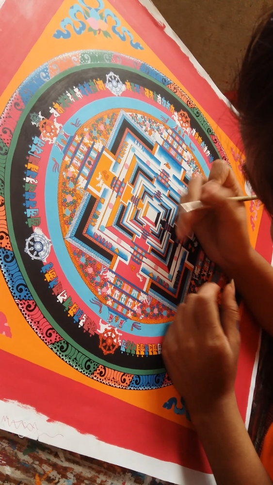 Namaste and Welcome to my Gallery!!! All of the paintings and arts in my gallery are originally handmade and hand-painted by my family members and other local artists who have been practicing their craft for over two decades. My father is Master Artists Nepal with an experience of more than four decades; you can see some of his work in this Gallery. Also you can see some of the beautiful and soulful artwork of talented local artists from Himalayas. ~~ Kalachakra Mandala Thangka~~ Kalachakra Mandala is a Sanskrit word for “wheel of time”. The mandala of kalachakra is aerial view of the kalachakra temple, situated in Lhasa and contains 722 Deities, and at its heart on a Lotus flower, a single Buddha: Kalachakra. It is a 5 level structure, each level is represented by a square, and each square is set within the others. In mandala there are six circles of elements: wisdom, space, wind, fire, water and earth. Then we get to different entrance of the body, speech and mind. The Dalai Lama and the Kalachakra Although thought to have once been a carefully guarded secret of the Shambhala Kingdom, the Kalachakra Tantra is now widely known. The Dalai Lama himself has given thirty-three separate initiations into this practice all over the world, including in Tibet, India, Switzerland, Canada, and the United States. In an essay on his website, His Holiness writes, “the Kalachakra initiations empower the disciple to practice the yoga of the Kalachakra tantra, and, ultimately, to achieve the state of Shri Kalachakra.” As with other mandala practices, the goal here is for the initiate to “enter” into the mandala and identify with the deity represented therein. The Kalachakra Mandala Through meditation on the Kalachakra mandala, monks invoke the qualities of the deity, striving in a ritualized way enter the mandala and become the deity themselves. This practice is not usually public, and mostly occurs behind temple walls. The floors of the palace depicted in the Kalachakra Mandala, from the ground up, represent: 1) Enlightened body 2) Enlightened speech 3) Enlightened mind 4) Enlightened wisdom 5) Enlightened great bliss Arrayed around the palace are four elemental rings and two outer rings. From the inside out they are: 1) Earth 2) Water 3) Fire 4) Wind 5) Space 6) Wisdom Taken together, all of these elements compose a microcosm of the universe, ruled by time personified. Size = 76cm x 63cm Material Used: • Cotton Canvas • Natural Pigments and colors • Gold leaf • Silk Fabric ~Excellent for meditation or home/office decor, ~Tibetan Yoga Wall Art ~Genuine 100% hand-painted from Himalayas Please feel free to contact me if you have any question regarding the painting.