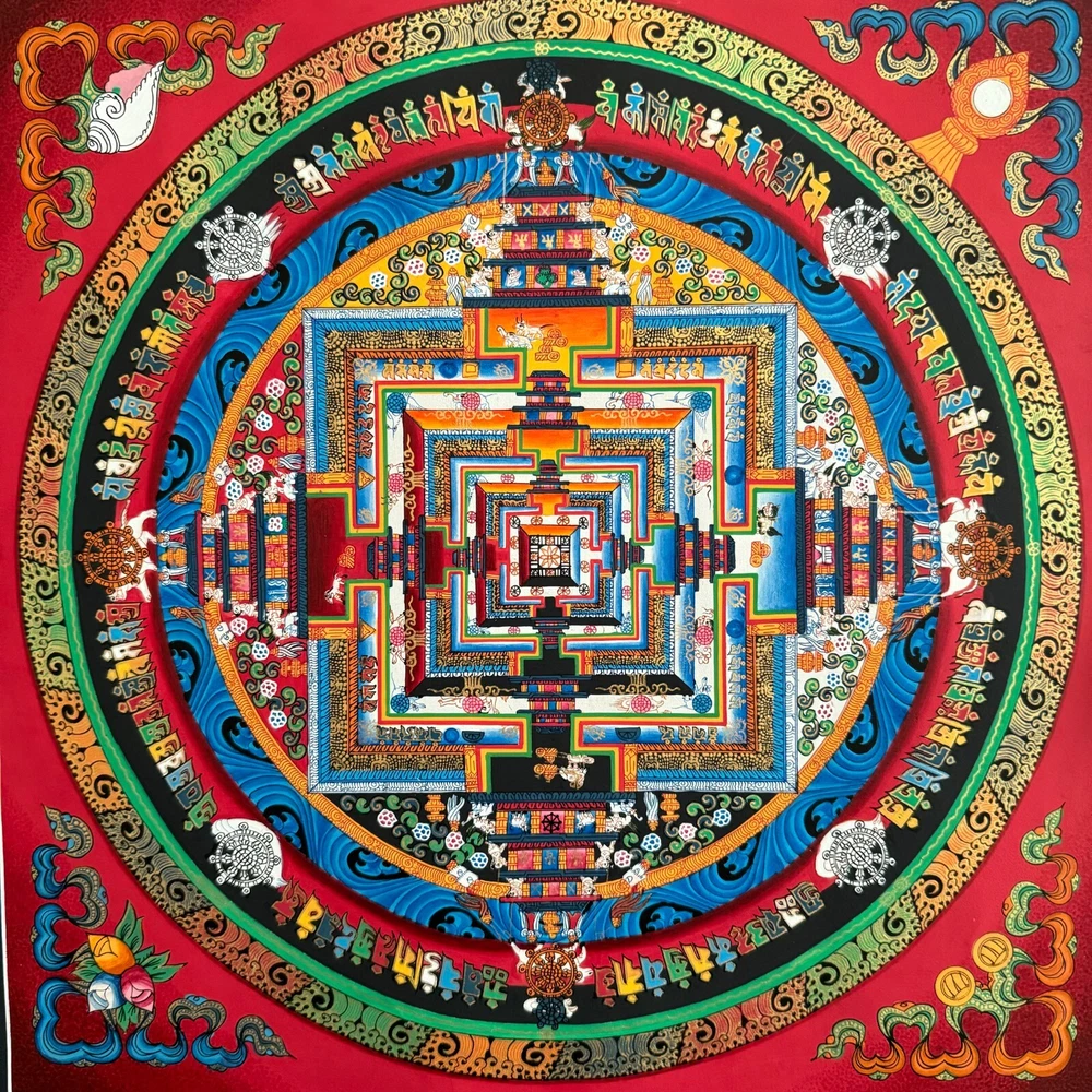Namaste and Welcome to my Gallery!!! All of the paintings and arts in my gallery are originally handmade and hand-painted by my family members and other local artists who have been practicing their craft for over two decades. My father is Master Artists Nepal with an experience of more than four decades; you can see some of his work in this Gallery. Also you can see some of the beautiful and soulful artwork of talented local artists from Himalayas. ~~ Kalachakra Mandala Thangka~~ Kalachakra Mandala is a Sanskrit word for “wheel of time”. The mandala of kalachakra is aerial view of the kalachakra temple, situated in Lhasa and contains 722 Deities, and at its heart on a Lotus flower, a single Buddha: Kalachakra. It is a 5 level structure, each level is represented by a square, and each square is set within the others. In mandala there are six circles of elements: wisdom, space, wind, fire, water and earth. Then we get to different entrance of the body, speech and mind. The Dalai Lama and the Kalachakra Although thought to have once been a carefully guarded secret of the Shambhala Kingdom, the Kalachakra Tantra is now widely known. The Dalai Lama himself has given thirty-three separate initiations into this practice all over the world, including in Tibet, India, Switzerland, Canada, and the United States. In an essay on his website, His Holiness writes, “the Kalachakra initiations empower the disciple to practice the yoga of the Kalachakra tantra, and, ultimately, to achieve the state of Shri Kalachakra.” As with other mandala practices, the goal here is for the initiate to “enter” into the mandala and identify with the deity represented therein. The Kalachakra Mandala Through meditation on the Kalachakra mandala, monks invoke the qualities of the deity, striving in a ritualized way enter the mandala and become the deity themselves. This practice is not usually public, and mostly occurs behind temple walls. The floors of the palace depicted in the Kalachakra Mandala, from the ground up, represent: 1) Enlightened body 2) Enlightened speech 3) Enlightened mind 4) Enlightened wisdom 5) Enlightened great bliss Arrayed around the palace are four elemental rings and two outer rings. From the inside out they are: 1) Earth 2) Water 3) Fire 4) Wind 5) Space 6) Wisdom Taken together, all of these elements compose a microcosm of the universe, ruled by time personified. Size = 76cm x 63cm Material Used: • Cotton Canvas • Natural Pigments and colors • Gold leaf • Silk Fabric ~Excellent for meditation or home/office decor, ~Tibetan Yoga Wall Art ~Genuine 100% hand-painted from Himalayas Please feel free to contact me if you have any question regarding the painting.