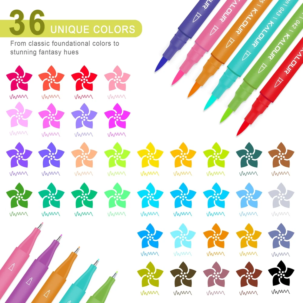 Kalour Dual Markers Brush Pens, 36 Fine Point Art Marker, Double Tip Colored Pen for Adult Coloring Hand Lettering Writing Planner 36 VIBRANT COLORS:Explore a rich palette of 36 vibrant colors, providing endless possibilities for your artistic creations.Ideal for a multitude of artistic pursuits:Hand Lettering,Coloring Books,Signing,Design,Art Projects,Planning & Journaling,Manga & Animation. BRUSH & FINE POINT DUAL TIPS:Experience the versatility of dual tips – BRUSH for sweeping strokes and blending, FINE POINT for intricate details like sketching and writing. COLOR NAME & NUMBERED:Effortlessly find your desired color with color name and numbered markers. The included DIY color chart allows you to match each marker to its corresponding block for easy reference during your creative process. SMOOTH FLOW, HIGH-QUALITY INK:Enjoy the benefits of high-quality water-based ink that flows smoothly. The ink's vibrant colors seamlessly blend, providing beautiful and consistent coloring effects without smudges. MULTIFUNCTIONAL & SUITABLE FOR ALL AGES:Ideal for various artistic pursuits such as drawing, lettering, coloring books, and sketching. Perfect for individuals of all ages, making it an excellent gift for artists, students, and creative enthusiasts. PORTABLE CASE:Housed in a case, these markers are perfect for creativity on the go. The organized case ensures that your vibrant, no-bleed markers are always at your fingertips.