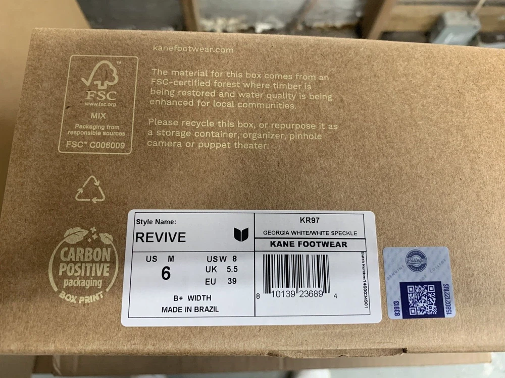Brand new with box Men's size 6, Women's size 8 All sales are final, no returns Fast shipping! KANE Revive shoes are made of bio-based closed-cell RestoreFoam™. The shoes don’t absorb moisture, so they’re just as functional in water as they are on land, and they’re quick-drying. The KANE Revive shoes can easily be wiped or washed off with soap and water. Please avoid exposure to extreme heat or sun for this can cause the shoes to shrink or warp. Dishwashers, washing machines, or hot cars can also cause the shoes to shrink or warp. The KANE Revive sizing follows the standard sizing for a running shoe. Therefore, the size guide should be utilized according to your typical running shoe size. IN BETWEEN SIZES? We recommend sizing down (ex. if you typically wear size 10.5 - select size 10). For a wider foot, go one half size up (ex. if you typically wear size 10.5 - select size 11).