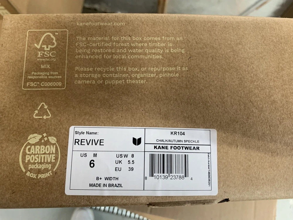 Brand new with box Men's size 6, Women's size 8 All sales are final, no returns Fast shipping! KANE Revive shoes are made of bio-based closed-cell RestoreFoam™. The shoes don’t absorb moisture, so they’re just as functional in water as they are on land, and they’re quick-drying. The KANE Revive shoes can easily be wiped or washed off with soap and water. Please avoid exposure to extreme heat or sun for this can cause the shoes to shrink or warp. Dishwashers, washing machines, or hot cars can also cause the shoes to shrink or warp. The KANE Revive sizing follows the standard sizing for a running shoe. Therefore, the size guide should be utilized according to your typical running shoe size. IN BETWEEN SIZES? We recommend sizing down (ex. if you typically wear size 10.5 - select size 10). For a wider foot, go one half size up (ex. if you typically wear size 10.5 - select size 11).