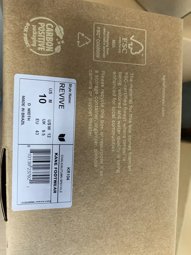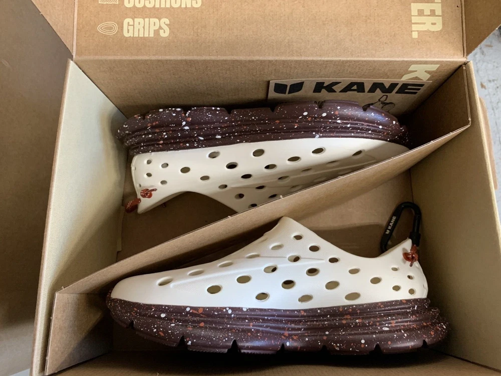 Brand new with box Men's size 10, Women's size 12 All sales are final, no returns Fast shipping! KANE Revive shoes are made of bio-based closed-cell RestoreFoam™. The shoes don’t absorb moisture, so they’re just as functional in water as they are on land, and they’re quick-drying. The KANE Revive shoes can easily be wiped or washed off with soap and water. Please avoid exposure to extreme heat or sun for this can cause the shoes to shrink or warp. Dishwashers, washing machines, or hot cars can also cause the shoes to shrink or warp. The KANE Revive sizing follows the standard sizing for a running shoe. Therefore, the size guide should be utilized according to your typical running shoe size. IN BETWEEN SIZES? We recommend sizing down (ex. if you typically wear size 10.5 - select size 10). For a wider foot, go one half size up (ex. if you typically wear size 10.5 - select size 11).