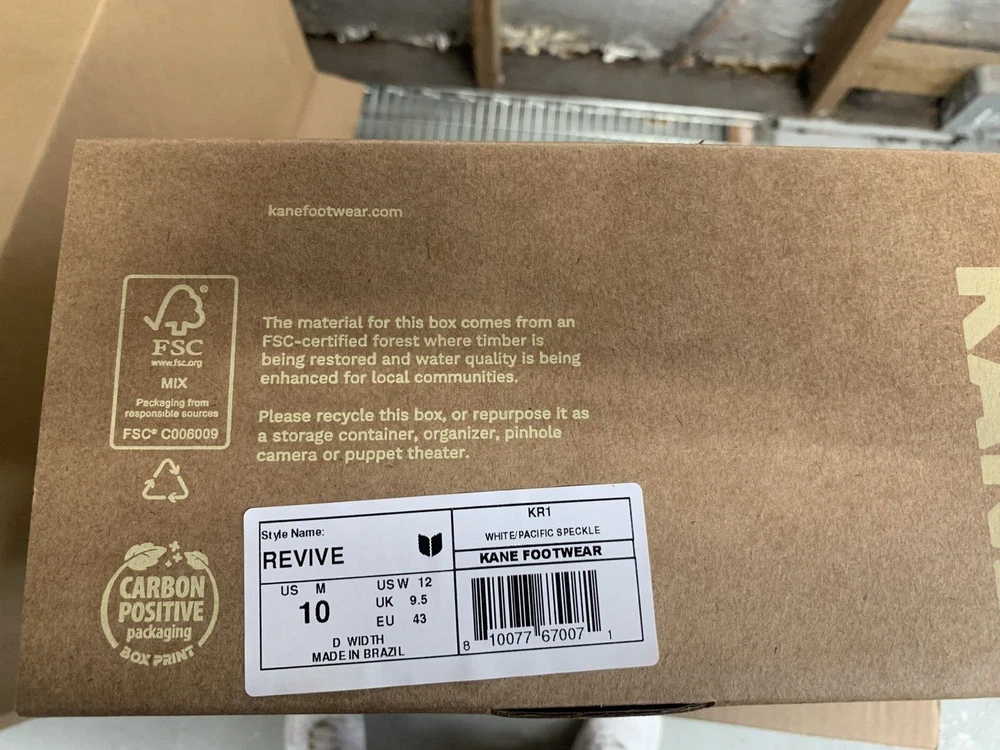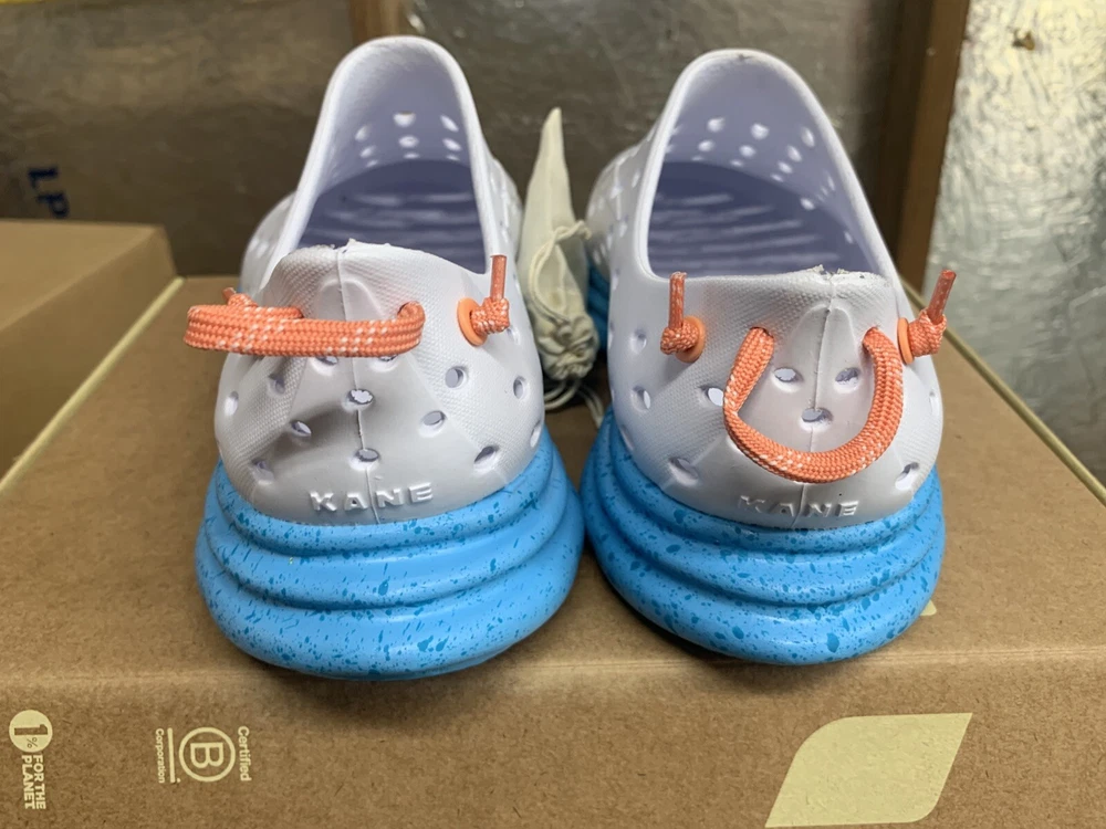Brand new with box Men's size 10, Women's size 12 All sales are final, no returns Fast shipping! KANE Revive shoes are made of bio-based closed-cell RestoreFoam™. The shoes don’t absorb moisture, so they’re just as functional in water as they are on land, and they’re quick-drying. The KANE Revive shoes can easily be wiped or washed off with soap and water. Please avoid exposure to extreme heat or sun for this can cause the shoes to shrink or warp. Dishwashers, washing machines, or hot cars can also cause the shoes to shrink or warp. The KANE Revive sizing follows the standard sizing for a running shoe. Therefore, the size guide should be utilized according to your typical running shoe size. IN BETWEEN SIZES? We recommend sizing down (ex. if you typically wear size 10.5 - select size 10). For a wider foot, go one half size up (ex. if you typically wear size 10.5 - select size 11).