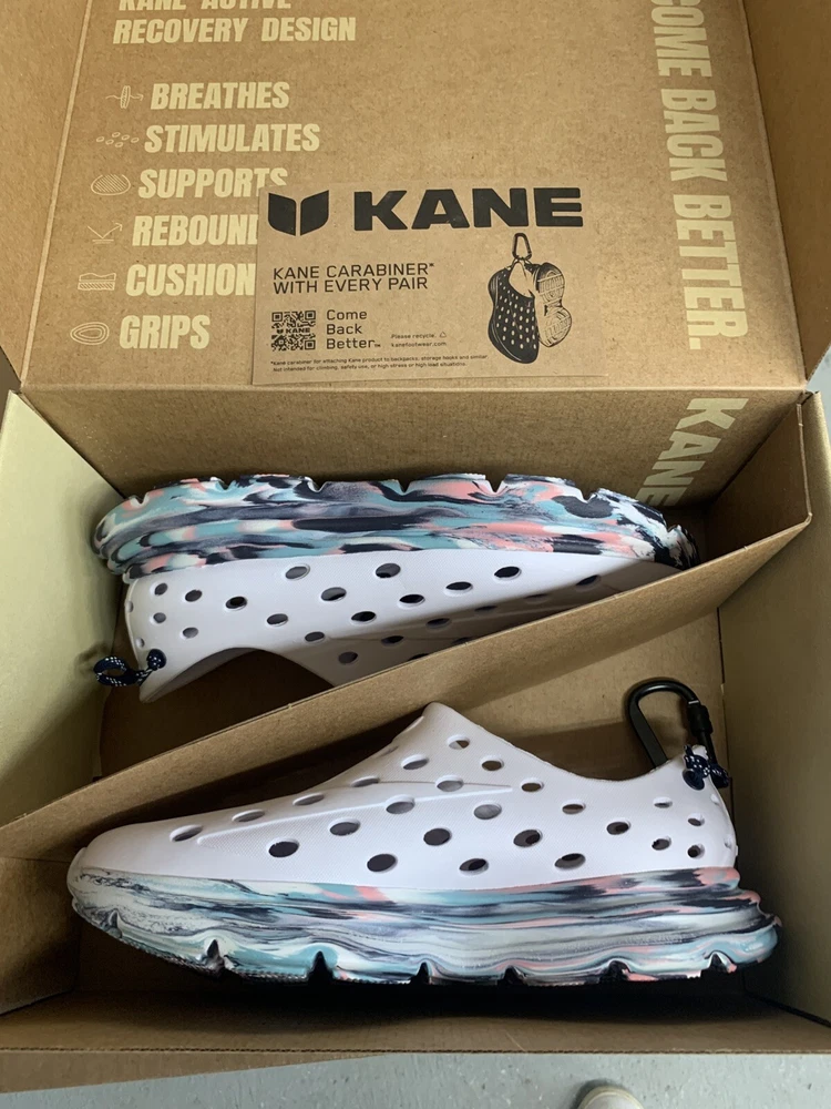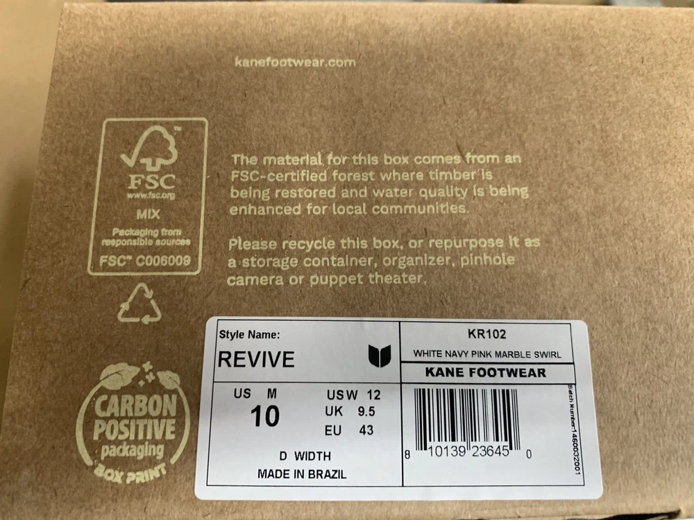 Brand new with box Men's size 10, Women's size 12 All sales are final, no returns Fast shipping! KANE Revive shoes are made of bio-based closed-cell RestoreFoam™. The shoes don’t absorb moisture, so they’re just as functional in water as they are on land, and they’re quick-drying. The KANE Revive shoes can easily be wiped or washed off with soap and water. Please avoid exposure to extreme heat or sun for this can cause the shoes to shrink or warp. Dishwashers, washing machines, or hot cars can also cause the shoes to shrink or warp. The KANE Revive sizing follows the standard sizing for a running shoe. Therefore, the size guide should be utilized according to your typical running shoe size. IN BETWEEN SIZES? We recommend sizing down (ex. if you typically wear size 10.5 - select size 10). For a wider foot, go one half size up (ex. if you typically wear size 10.5 - select size 11).