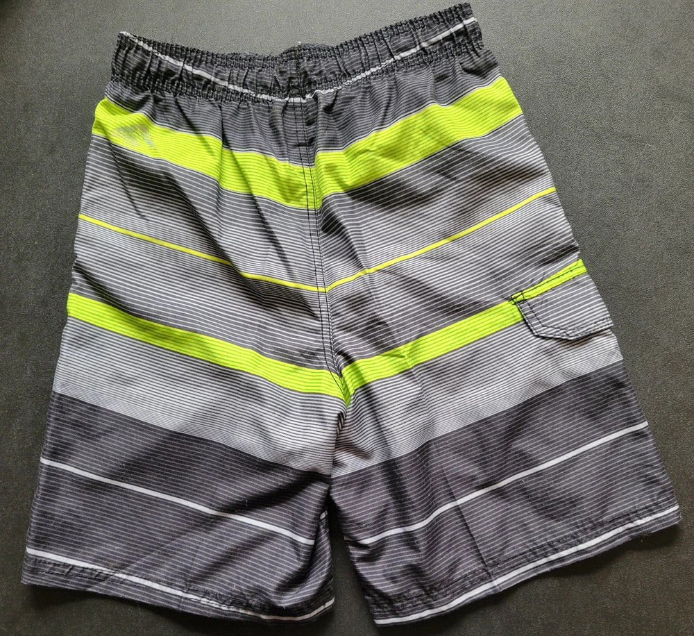 USA youth medium 10-12. Black, gray, and neon green horizontal stripes. Two slash/hip pockets and one velcro cargo pocket on the thigh. Mesh brief lining. Drawstring and elastic stretch waist. Decorated with logo. 100% polyester. Machine wash cold.