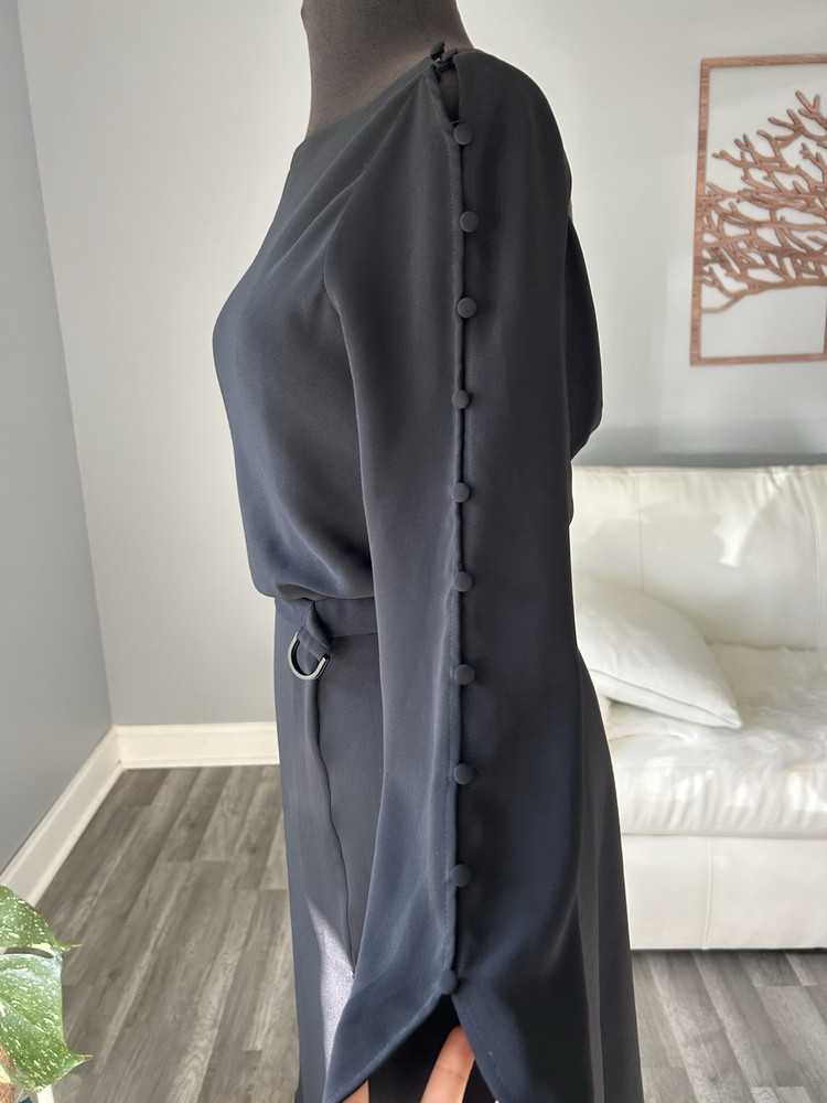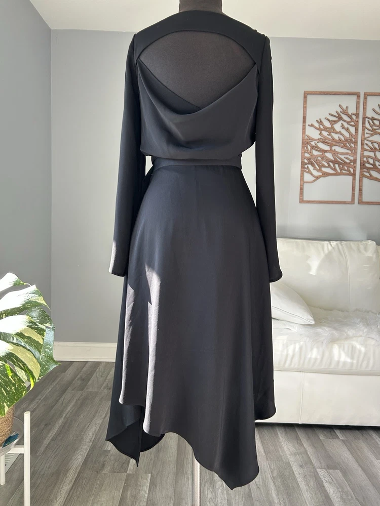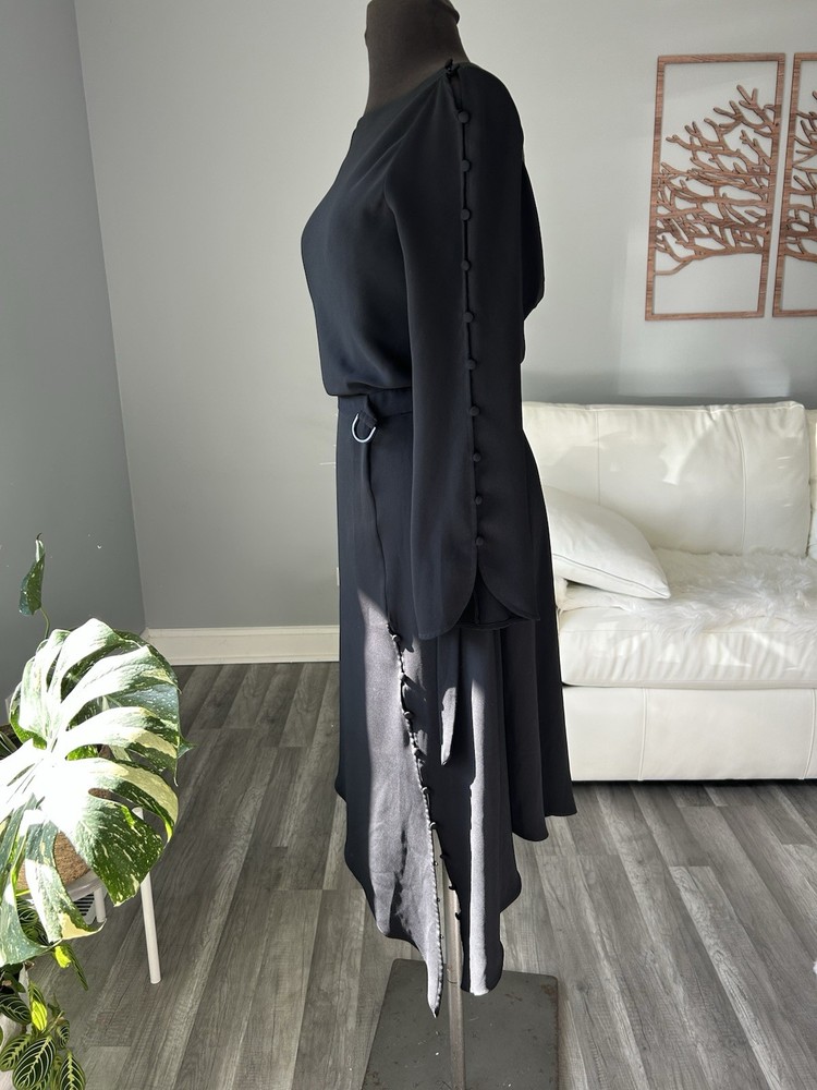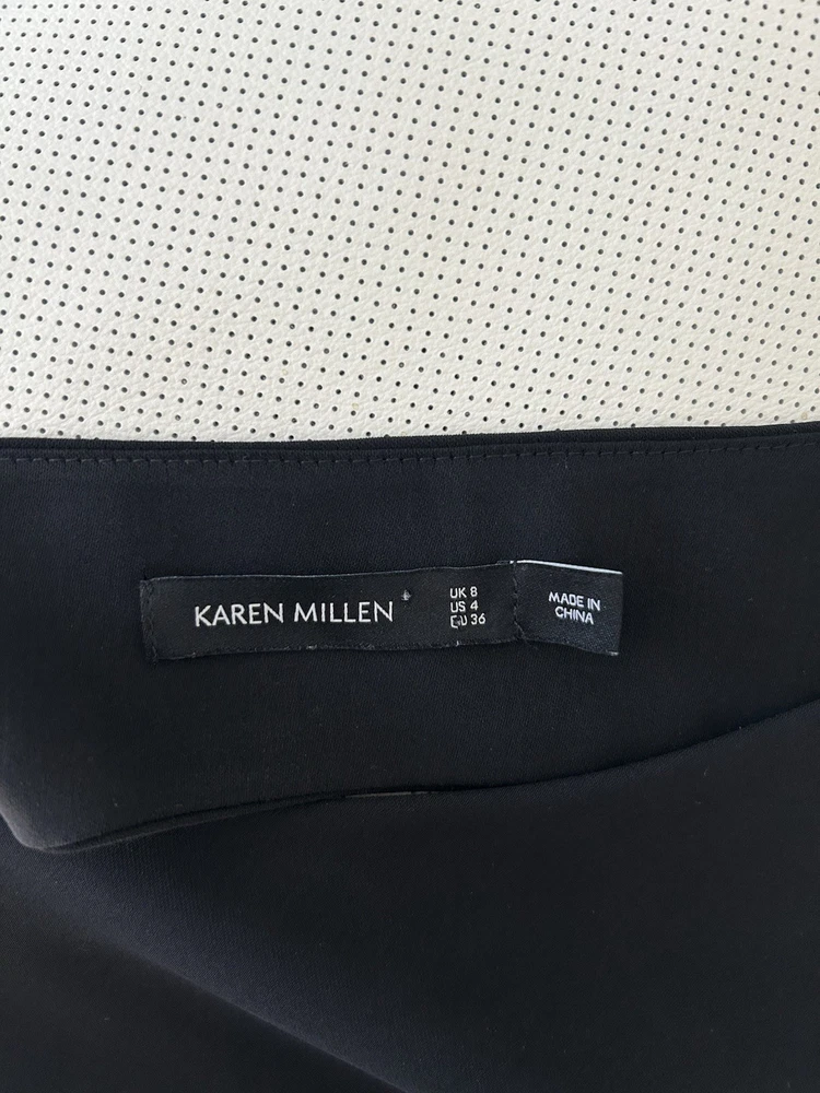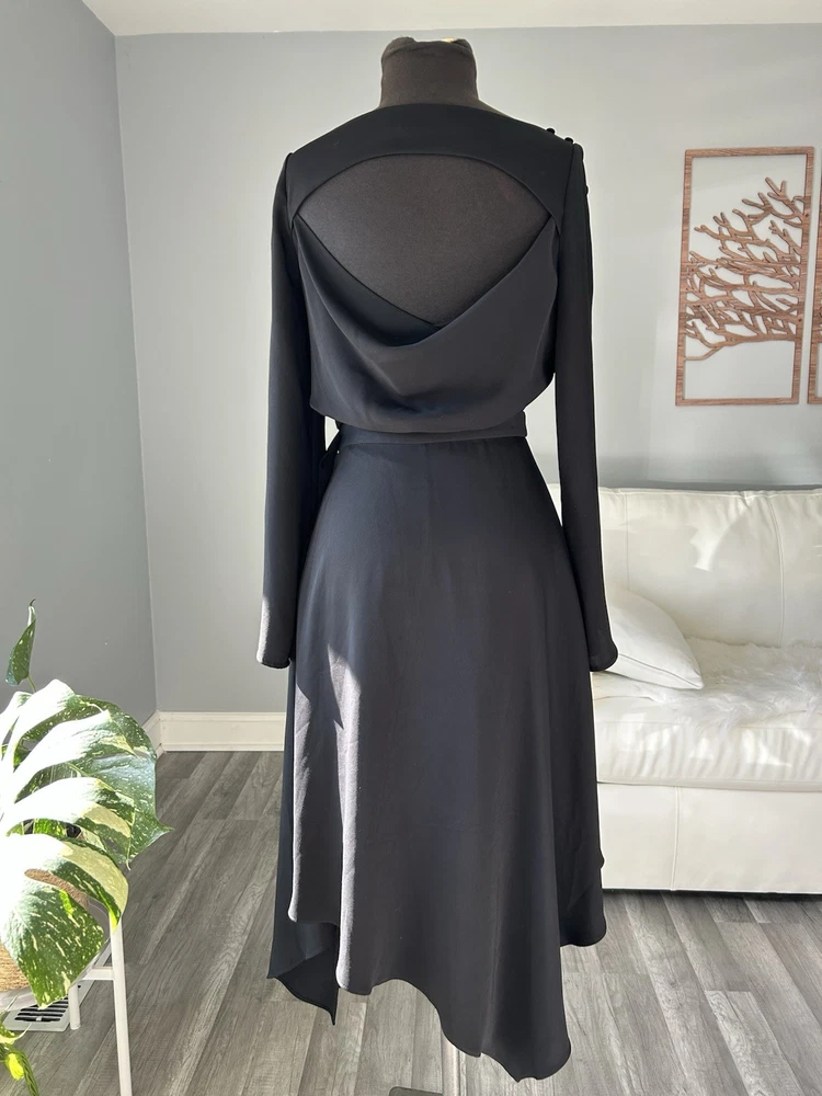 This Karen Millen women's dress in size US 4 is a sleek black fit and flare style made from 100% polyester. The dress features an asymmetric length, making it a stylish and unique choice for any occasion. Perfect for those who appreciate high-quality materials and a flattering silhouette.