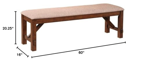 The karven acacia bench is a great addition to the karven dining table. Featuring thick, sturdy, straight legs and a plush 100% polyester upholstered tan seats, the frame is finished in a dark Hazelnut. Some assembly required. Thick, Sturdy, straight legs. Dark Hazelnut Finish 100% polyester upholstered tan Seat A great addition to the karven dining table. 60"L x 16"W x 20-1/4" H Some assembly required. Color may vary from the pictures.