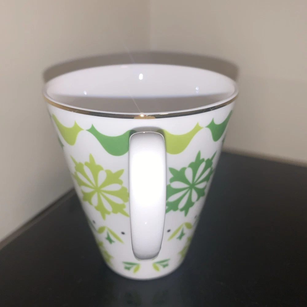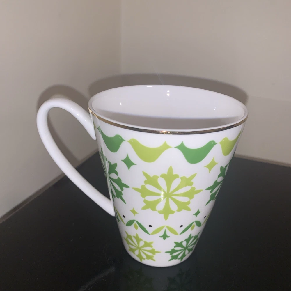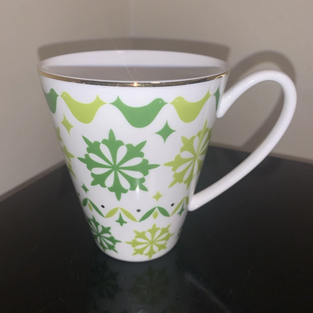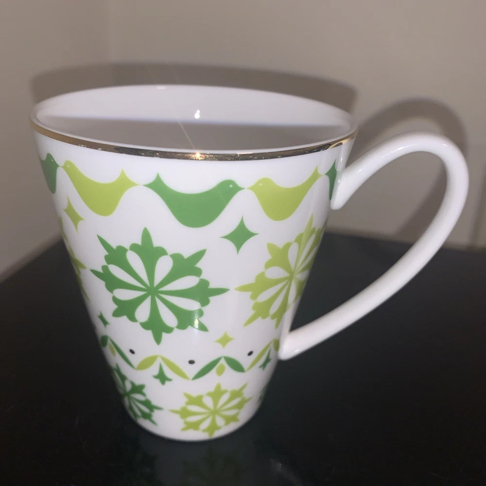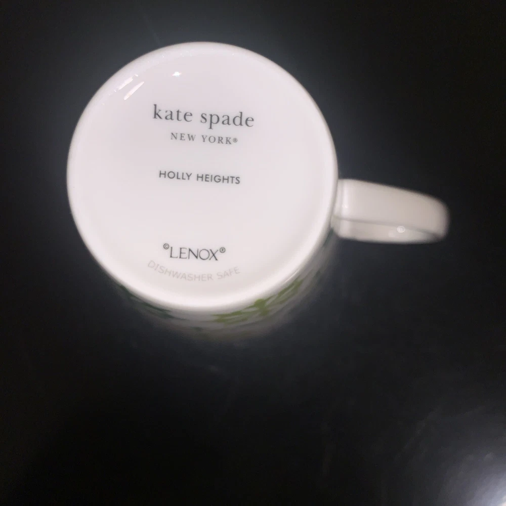 This Kate Spade New York Holly Heights Mug is a small round porcelain mug featuring a geometric floral and doves pattern in white and green colors. It is part of the Heights collection and has a capacity of 4 inches high and 3.5 inches in diameter, with a painted design. The mug is dishwasher safe, making it convenient for everyday use. Perfect for occasions like Best Wishes, Christmas, birthdays, or as a replacement piece in a set, this mug is a stylish and functional addition to any kitchen or collection.