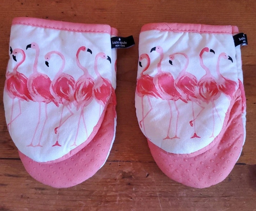 Kate Spade Of New York Pink Flamingos Kitchen Towels Mini Oven Mitts Set Of 4 In new unused condition Set includes: Kate Spade 1 pair of oven mitts and 2 tea towels Lot