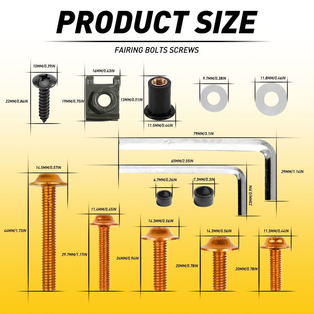 This fairing bolt kit is a game-changer for any Kawasaki owner! The gold aluminum screws add a sleek, custom look while the variety of sizes ensures a perfect fit for all panels. Love how easy they were to install—no stripped threads or alignment issues. The heat shield protection is a smart bonus, and the quality feels premium compared to stock bolts. My bike now has that high-end detail that makes it stand out at meets. Worth every penny for the style upgrade alone!