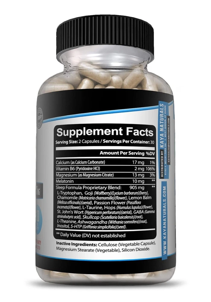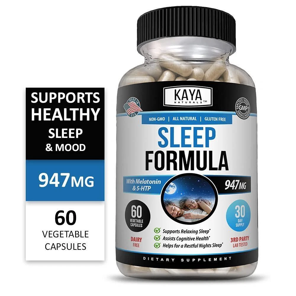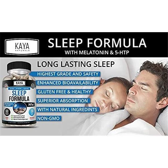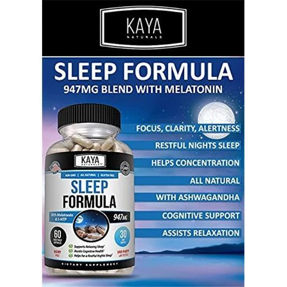 Kaya Naturals - Sleep Support Formula with Melatonin - Aid Support Vitamin Supplement - Sleep Stress and Mood Support - L-Tryptophan, Passion Flower, Ashwagandha and More - 60 Capsules (60 Count) Our all-natural, non-GMO, gluten-free Sleep Formula is a Propriety Blend that includes Melatonin, L-Tryptophan, Lemon Balm, and Passion Flower, Ashwagandha, and 5-HTP With all the stresses and distractions of life, high quality sleep is important With this natural sleep supplement you will be able sleep better and reap the benefits that added hours of quality sleep can bring