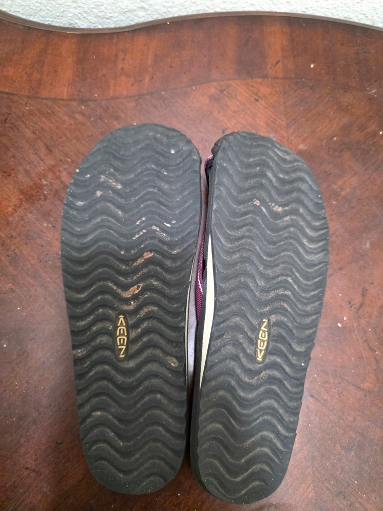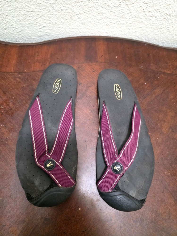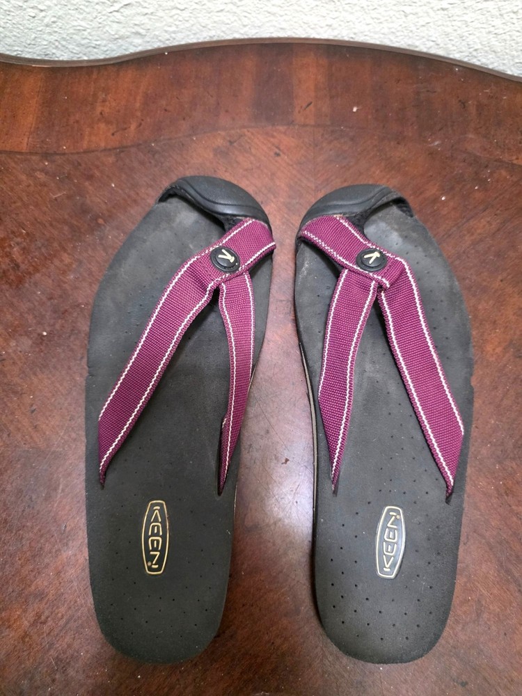 Designed for all-day comfort, these Keen flip flops feature a sturdy construction complemented by perforated insoles for breathability and a stylish look. • Durable rubber sole for stability • Soft fabric strap with stitching detail • Easy slip-on design • Lightweight for comfortable wear • Embossed Keen logo on sole CONDITIONS pre owned, Light wear on soles and minor scuffing on footbed; good condition. see photos for more details.