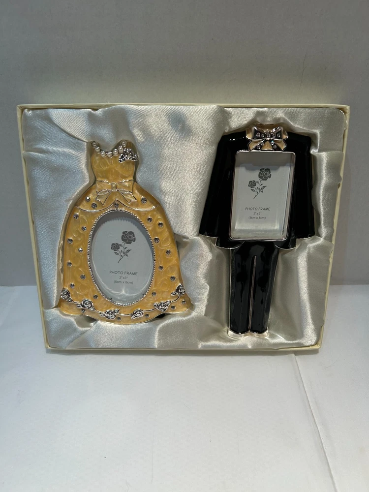 The "Keepsakes and Memories Picture Frames Wedding/Prom Dress and Tuxedo" is a set of two contemporary metal tabletop frames designed for special occasions like weddings, anniversaries, or engagements. The frames feature a dress and suit pattern, suitable for displaying photos in portrait orientation. The interior dimensions accommodate photo sizes of 3"×2" and 2-1/2"×1-5/8", with item heights of 5-1/2" and 6-1/2" and widths of 4-1/2" and 3-1/2" respectively. These rear-loading frames are freestanding and make for a stylish way to preserve cherished memories from formal events.