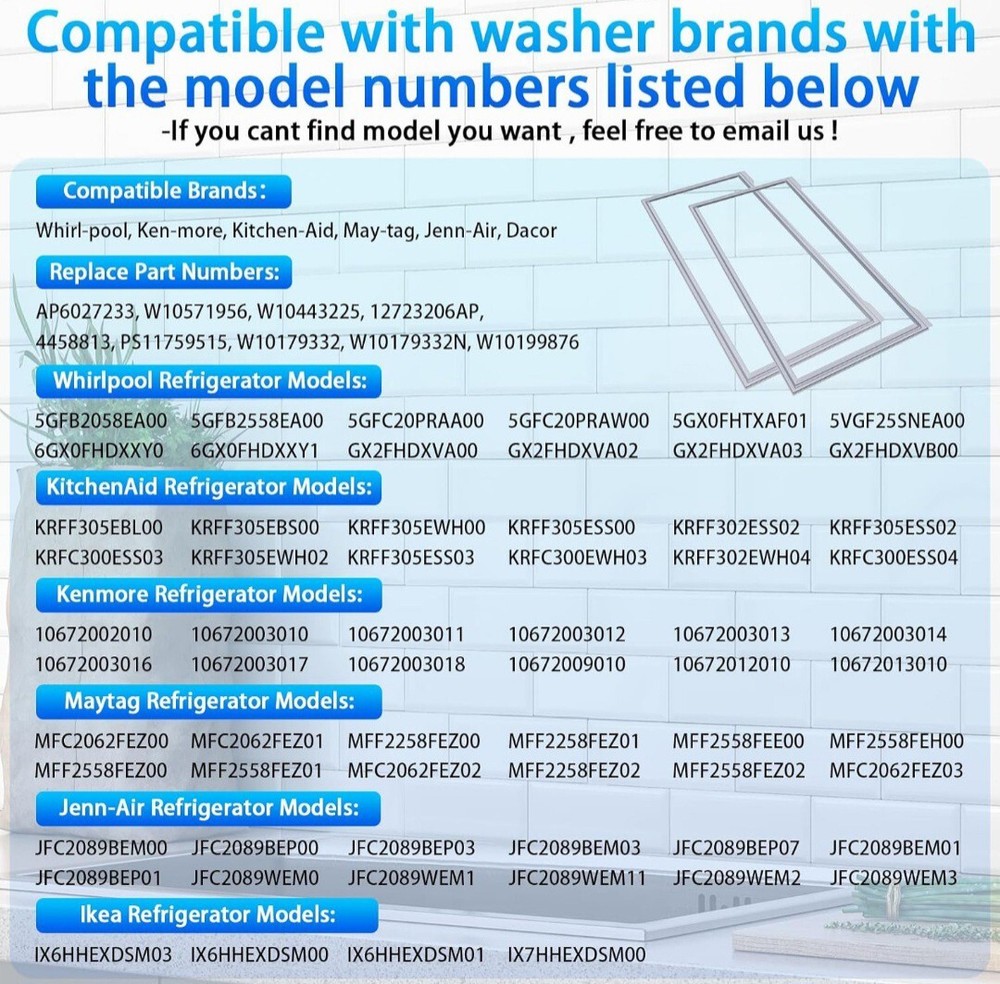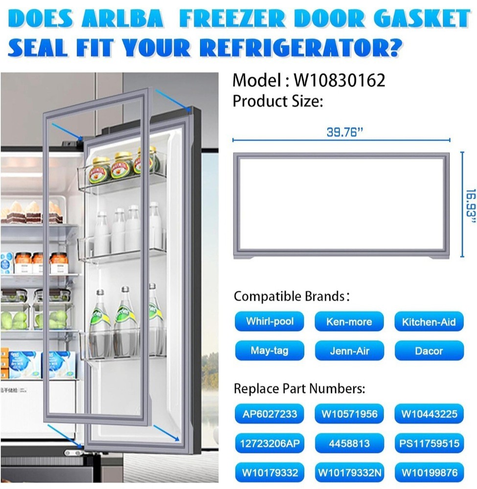 Package Note:You Will Receive 1 PackageSet Includes:Seal/GasketColor:GrayMaterial:EPDMModel:Whirlpool Jenn Air Maytag Kenmore Number of Items in Set:1Brand:ArlbaUPC:Does not applygtin13:Does not applyType:Refrigerator Door GasketSuitable For:RefrigeratorSize:W 16-7/8 (in) * H 39-3/8 (in)