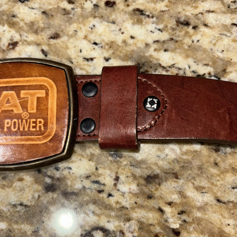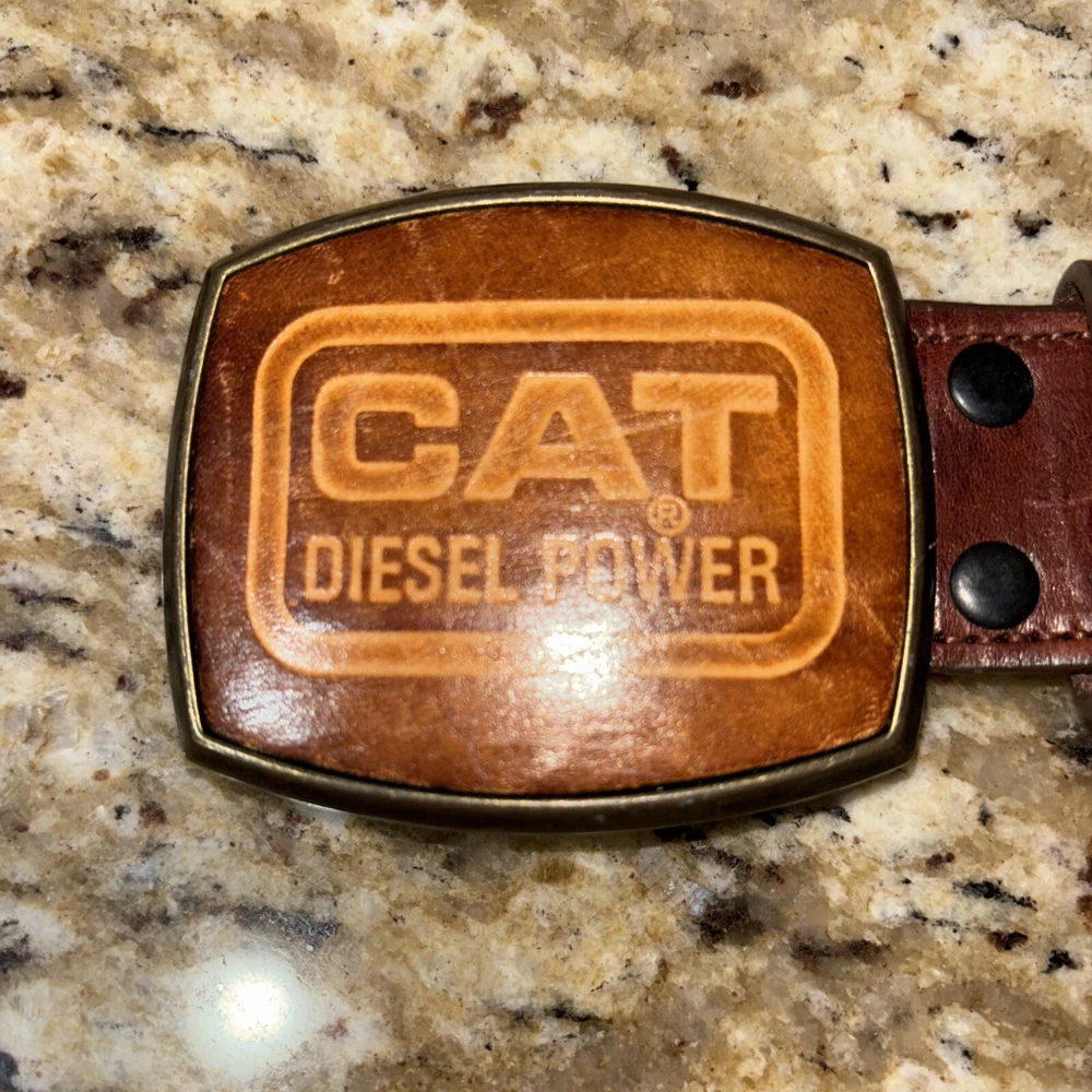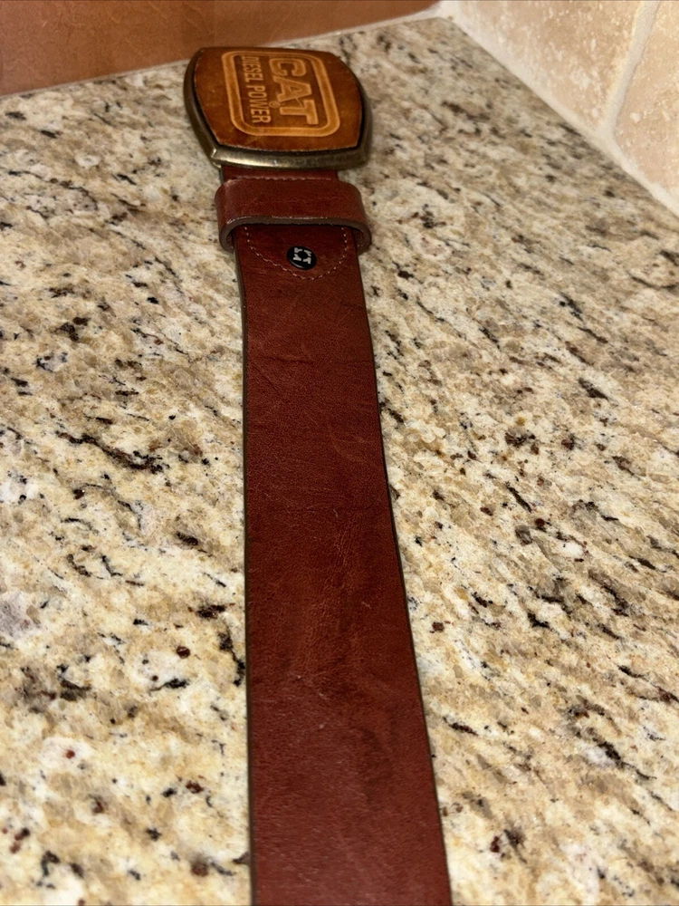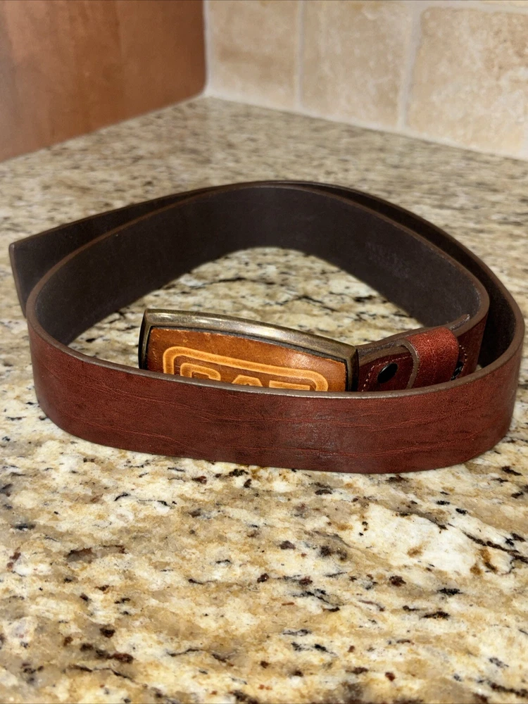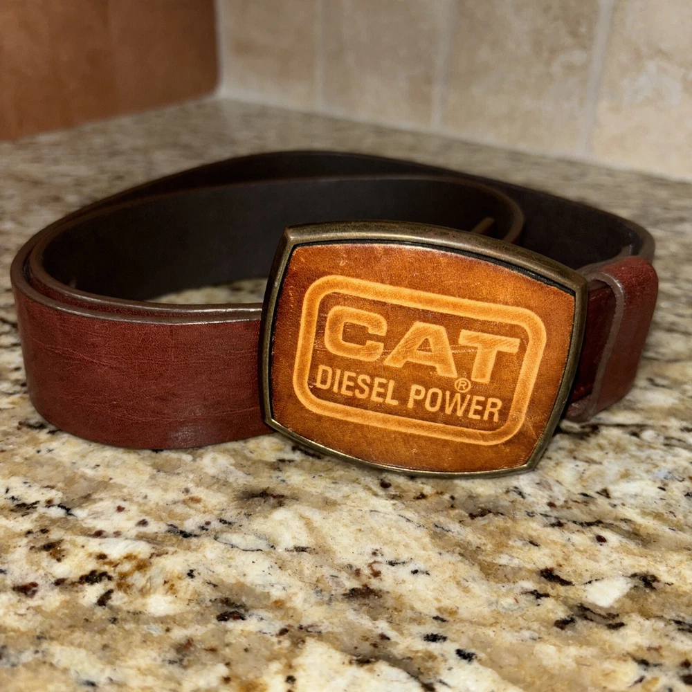 This is a unique Kenneth Cole Reaction leather belt featuring a rugged CAT Diesel Power buckle. Crafted from genuine leather, this belt is marked as a size 36/90 and handcrafted in China. The belt’s quality design and the bold CAT Diesel Power logo on the buckle make it a standout accessory, ideal for CAT enthusiasts or collectors. The leather shows light wear, adding vintage charm. Please refer to the photos for more details on the buckle and belt condition.