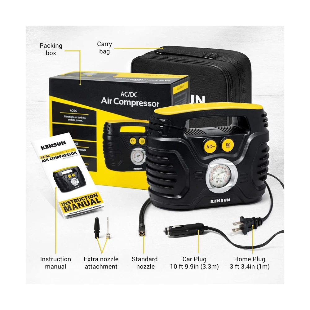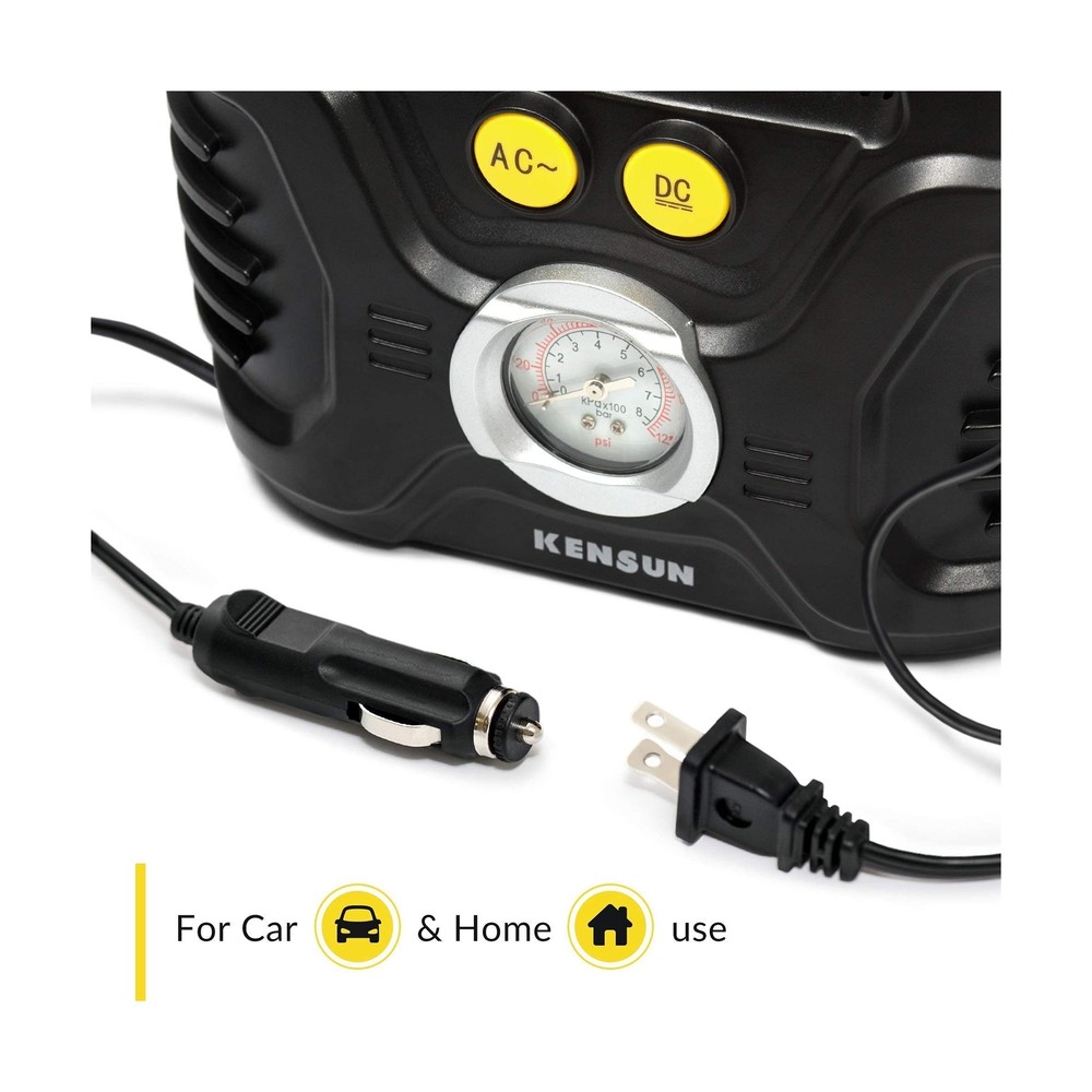 Fast inflation: Dual solid metal motors provide superb power, which will make your tire inflation super-fast and easy. AC/DC for car and home: ’s unique AC/DC switching with 12V car cigarette light plug as well as 110V wall plug for home outlet makes this inflator more useful since you can use it anywhere. Easy to read: Large, bright, classic pressure gauge with unit conversion (PSI/Bar/KPA) that measures up to 100 PSI, giving you clarity at a glance. Multi-Purpose: Inflate tires of cars, bikes, sedan and midsize SUV. Adaptors for balls and inflatables included, in addition to the unique AC/DC capabilities makes this inflator useful in any situation. Built to last: When you buy a product you know that you are getting high quality, durable construction that has been tested rigorously.