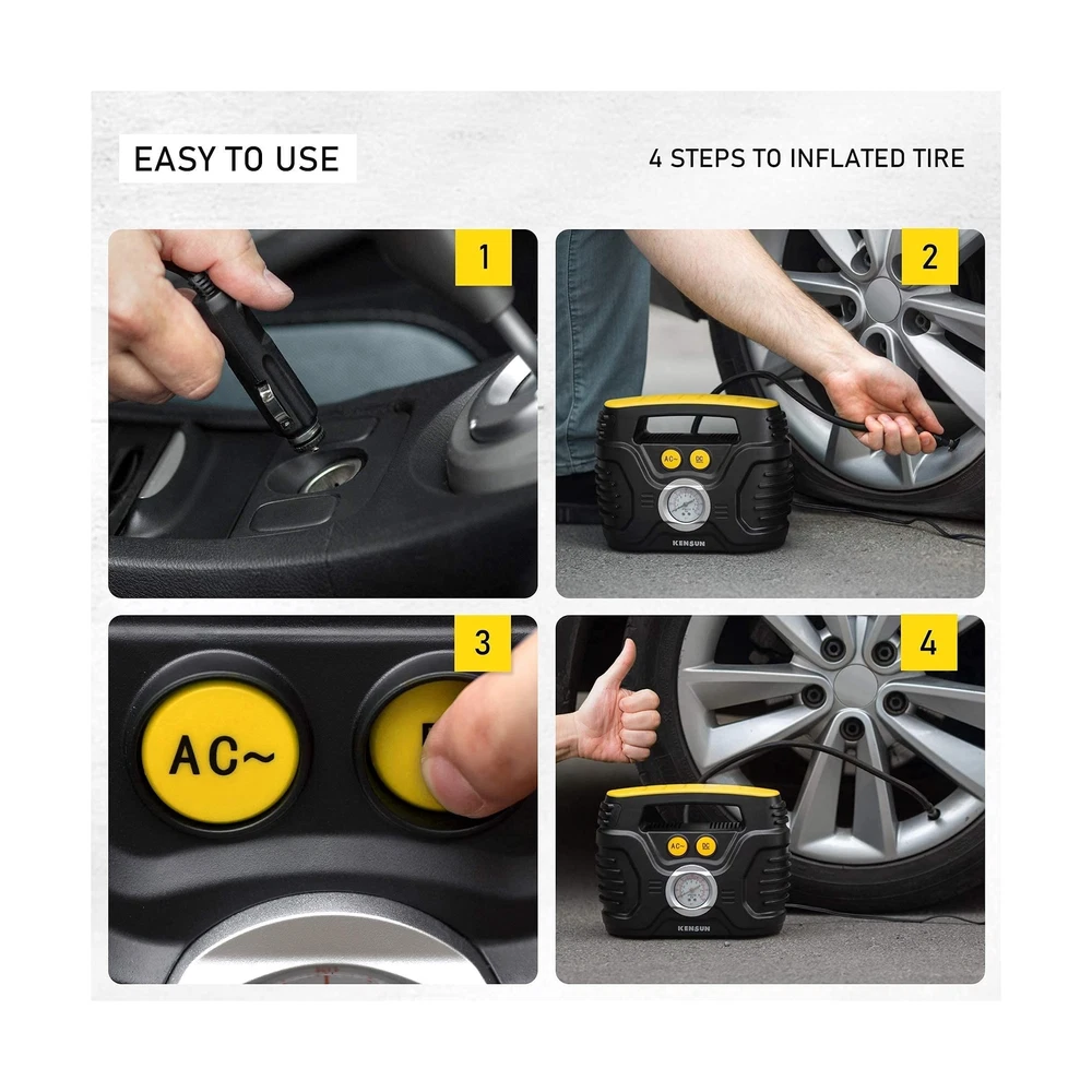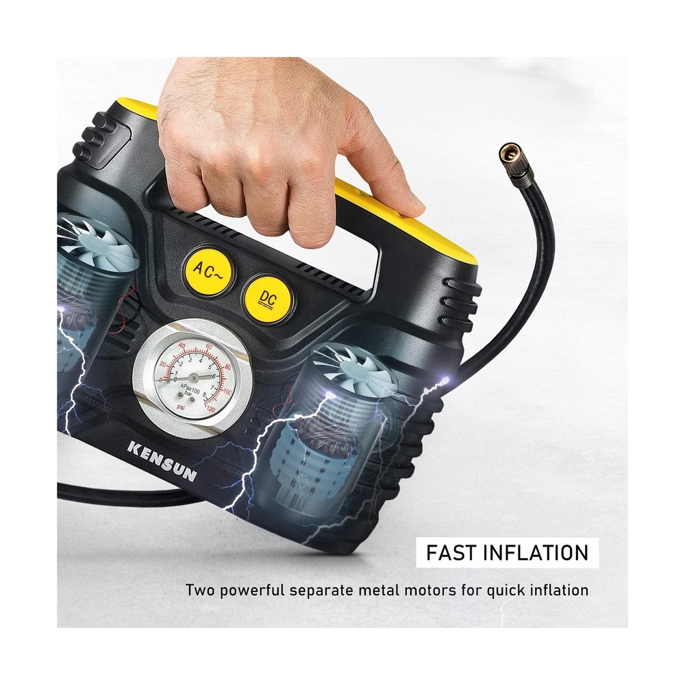 This air compressor is a game-changer—fast, powerful, and versatile! The dual metal motors make inflating tires a breeze, and the AC/DC option means you can use it at home or on the go. The large pressure gauge is super easy to read, and it handles everything from car tires to sports gear flawlessly. Perfect for emergencies or everyday use!