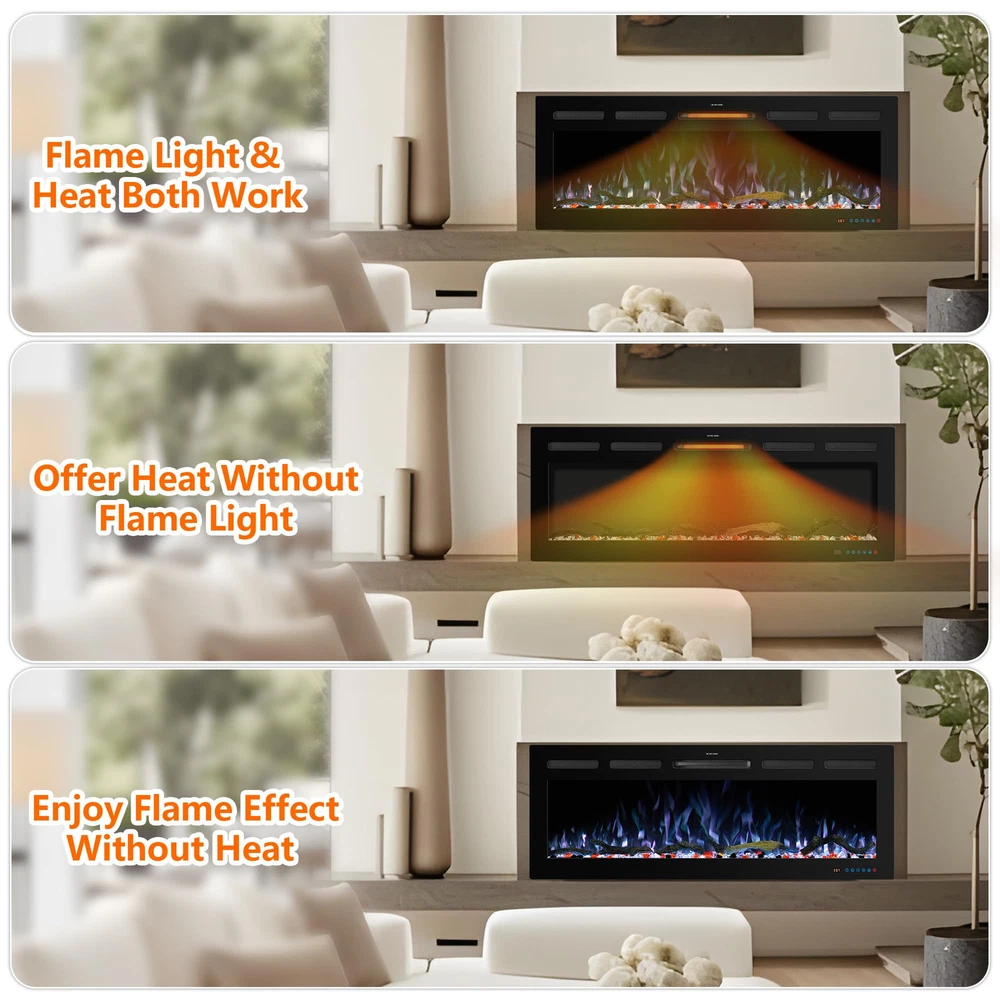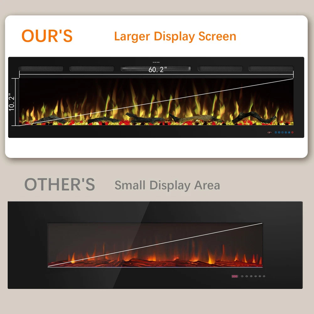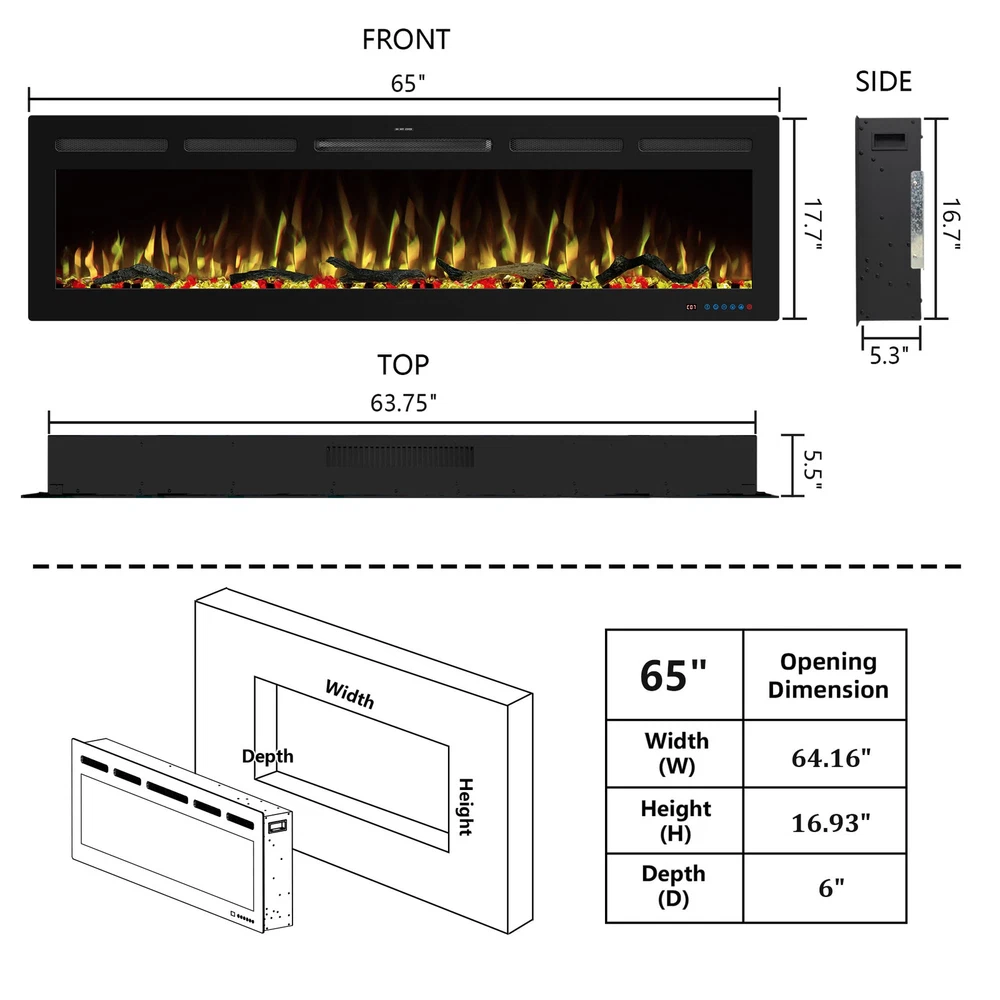 Overall Dimension: 65"L X 5.5"D X 17.7"H. The electric fireplace inserts dimension: 63.7"L X 5.3"D X 16.7"H. Wall-mounted and recessed installation, offering versatility in how it can be integrated into living space. Dual Heat Modes & Temperature Control: The electric fireplace offers versatile heating options with 750W and 1500W heat settings, allowing to adjust the warmth for all seasons and room sizes. the thermostat can set the temperature anywhere between 62°F to 99°F for energy saving purpose, providing a comfortable and customizable environment for your space. Realistic flame & Dynamic Lighting: 13 x 13 flame and fuel bed color options allows to freely create a personalized and inviting atmosphere, meanwhile match your decor and mood effortlessly. The light cycling feature adds a dynamic visual element to your space, creating a captivating and realistic flame effect that enhances the overall appeal of the fireplace. 5 brightness setting & independent heating: Tailor the ambiance with 5 flame brightness levels and create the perfect amount of glow for any occasion. The fireplace offers independent heating functionality, just use the heating feature without the flame effect, providing flexibility and control over the fireplace's operation. Convenient Controls: This fireplace heater is equiped with mobile app, remote and touch screen control. Three ways to switch at will offer the greatest convenience to adjust settings from anywhere in the room without leaving seat. Including 1-9 hours timer setting enhance overall relaxation and flexibility.