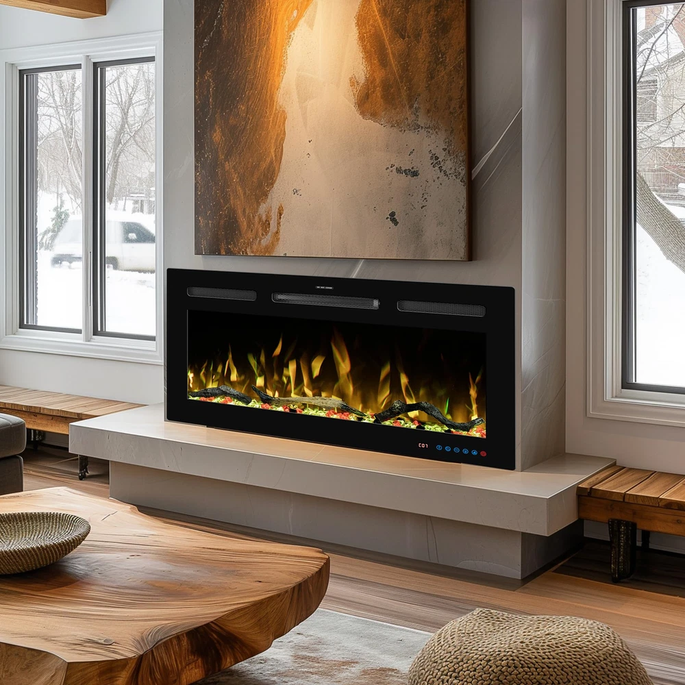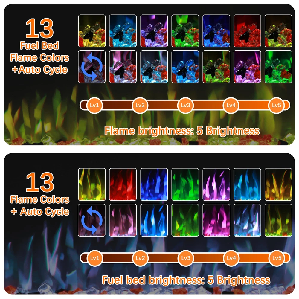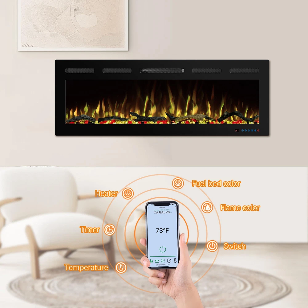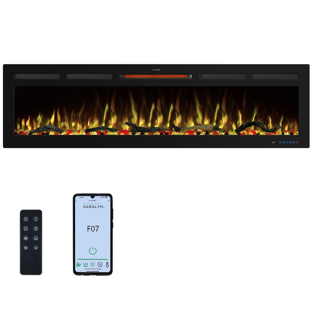 Overall Dimension: 65"L X 5.5"D X 17.7"H. The electric fireplace inserts dimension: 63.7"L X 5.3"D X 16.7"H. Wall-mounted and recessed installation, offering versatility in how it can be integrated into living space. Dual Heat Modes & Temperature Control: The electric fireplace offers versatile heating options with 750W and 1500W heat settings, allowing to adjust the warmth for all seasons and room sizes. the thermostat can set the temperature anywhere between 62°F to 99°F for energy saving purpose, providing a comfortable and customizable environment for your space. Realistic flame & Dynamic Lighting: 13 x 13 flame and fuel bed color options allows to freely create a personalized and inviting atmosphere, meanwhile match your decor and mood effortlessly. The light cycling feature adds a dynamic visual element to your space, creating a captivating and realistic flame effect that enhances the overall appeal of the fireplace. 5 brightness setting & independent heating: Tailor the ambiance with 5 flame brightness levels and create the perfect amount of glow for any occasion. The fireplace offers independent heating functionality, just use the heating feature without the flame effect, providing flexibility and control over the fireplace's operation. Convenient Controls: This fireplace heater is equiped with mobile app, remote and touch screen control. Three ways to switch at will offer the greatest convenience to adjust settings from anywhere in the room without leaving seat. Including 1-9 hours timer setting enhance overall relaxation and flexibility.