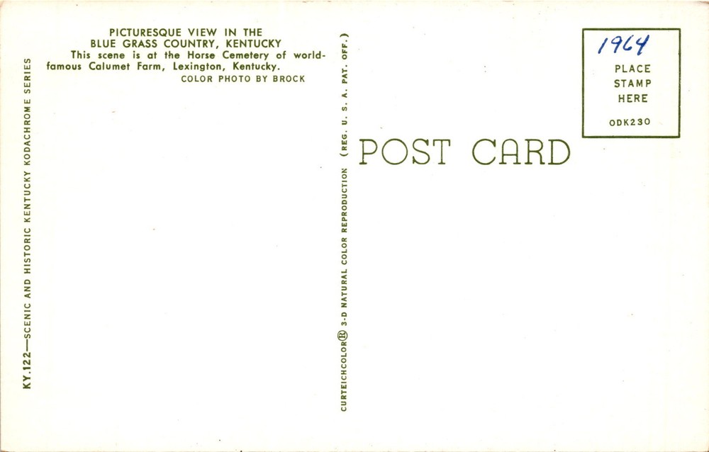 MAKE AN OFFER. THE MORE YOU BUY THE BETTER DEAL I WILL ACCEPT The postcard features a picturesque view from the Blue Grass Country in Kentucky, specifically at the Horse Cemetery of the renowned Calumet Farm in Lexington. The image was captured in color by Brock as part of the scenic and historic Kentucky Kodachrome Series in 1964. The Curteich Color reproduction highlights the natural colors in the photograph.