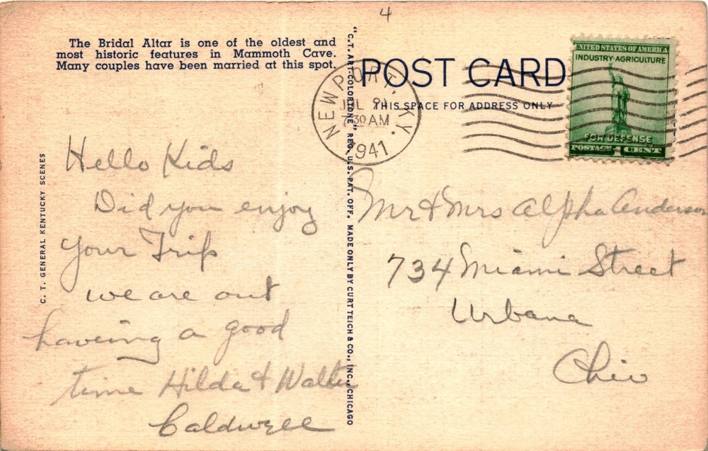 MAKE AN OFFER. THE MORE YOU BUY THE BETTER DEAL I WILL ACCEPT The postcard features an image of the Bridal Altar in the Mammoth Cave of Kentucky, which is described as one of the oldest and most historic features in the cave. The text on the postcard mentions that many couples have been married at this spot. The postcard also includes a message asking if the recipients, Mr. and Mrs.