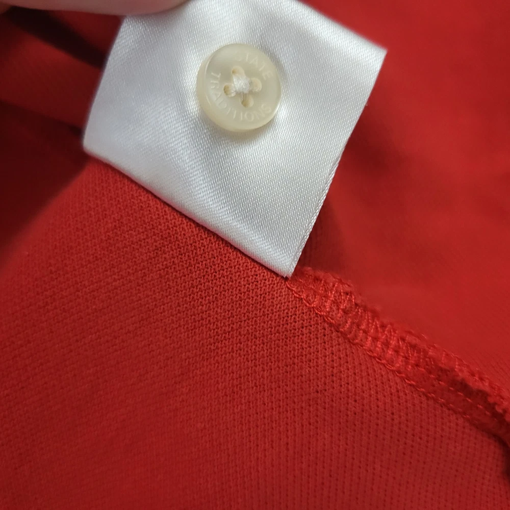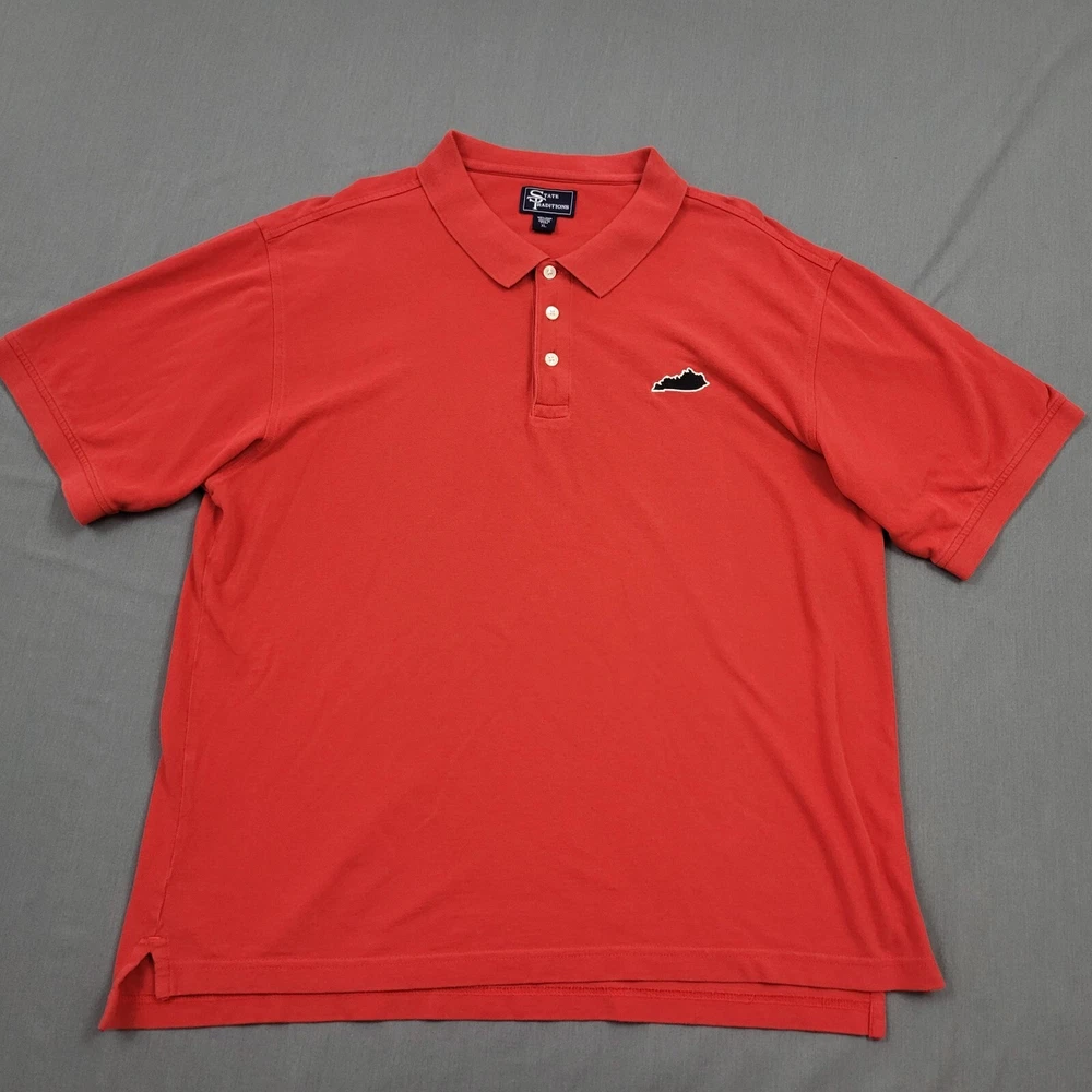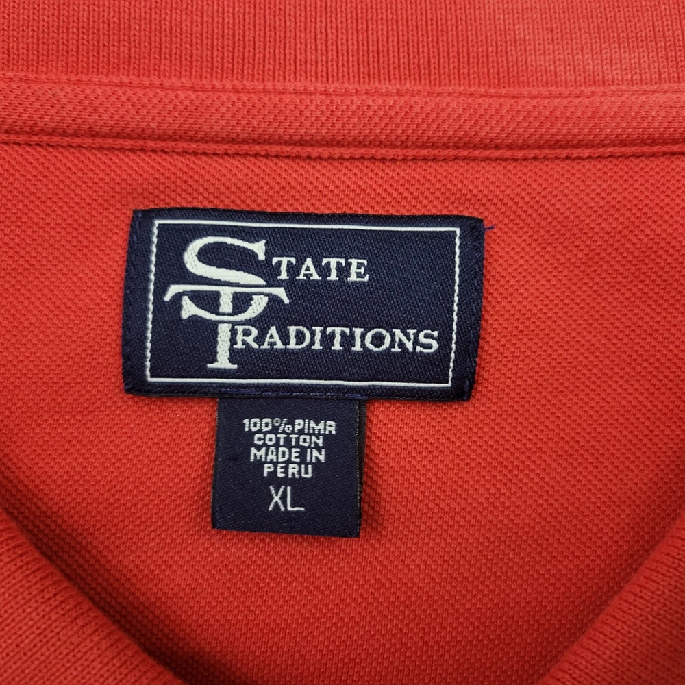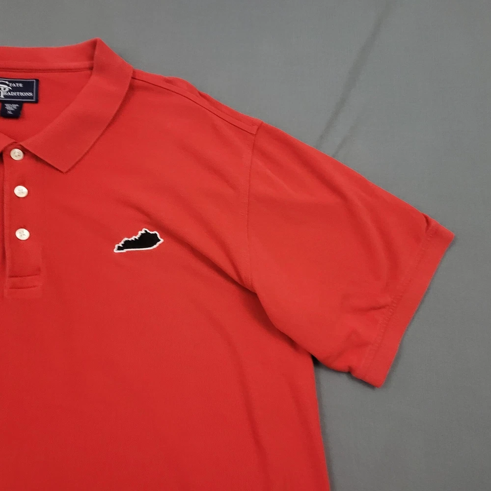 Occasion: Casual Features: Lightweight Accents: Button Theme: State Performance/Activity: Walking Neckline: Collared Size: XL Collar Style: Button-Down Material: Cotton Closure: Pullover Color: Red Fit: Regular Department: Men Fabric Wash: Medium Pattern: Solid Fabric Type: Knit Brand: State Traditions Size Type: Regular Type: Polo Sleeve Length: Short Sleeve