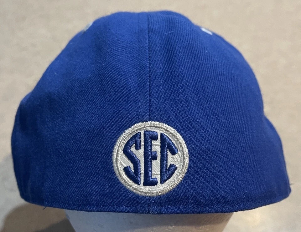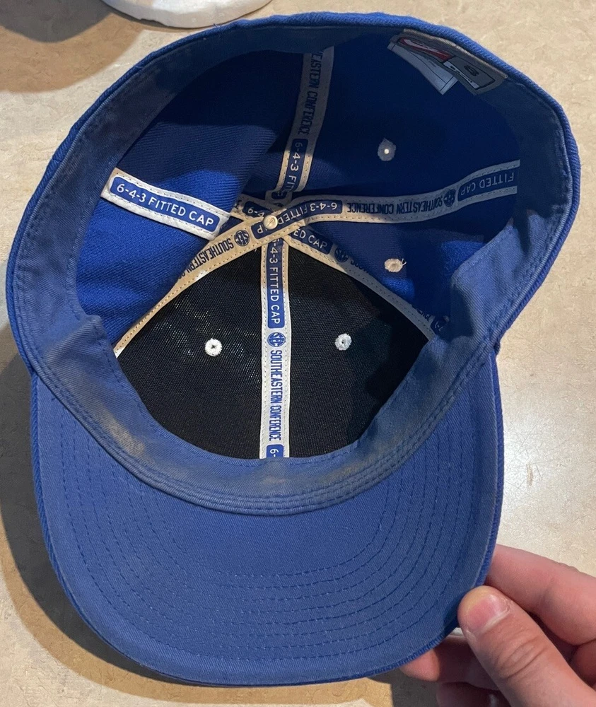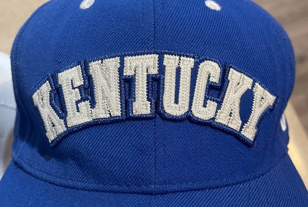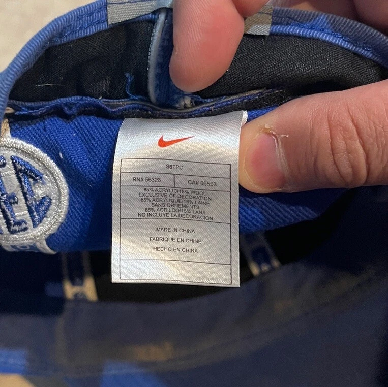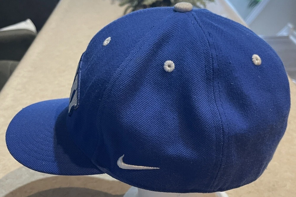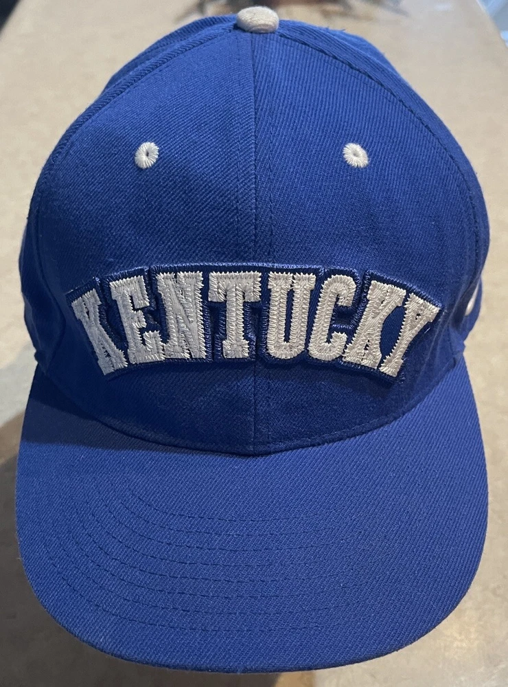 Show off your love for the Kentucky Wildcats with this Nike fitted hat cap. The blue cap features an embroidered design with the team's logo and name, making it the perfect accessory for any fan. It's officially licensed and made from high-quality materials, ensuring that it will last for years to come. This cap is perfect for basketball fans, especially those who support the Kentucky Wildcats. It's designed for men and comes in size 8, making it a great gift for any fan. The hat is perfect for regular season games and is sure to turn heads during the NCAA Tournament. Get yours today and show off your love for the Kentucky Wildcats! This hat is in worn preowned condition with some staining on the inside brim of the hat. Please see ALL photos for a better idea on condition, and any details to the hat.