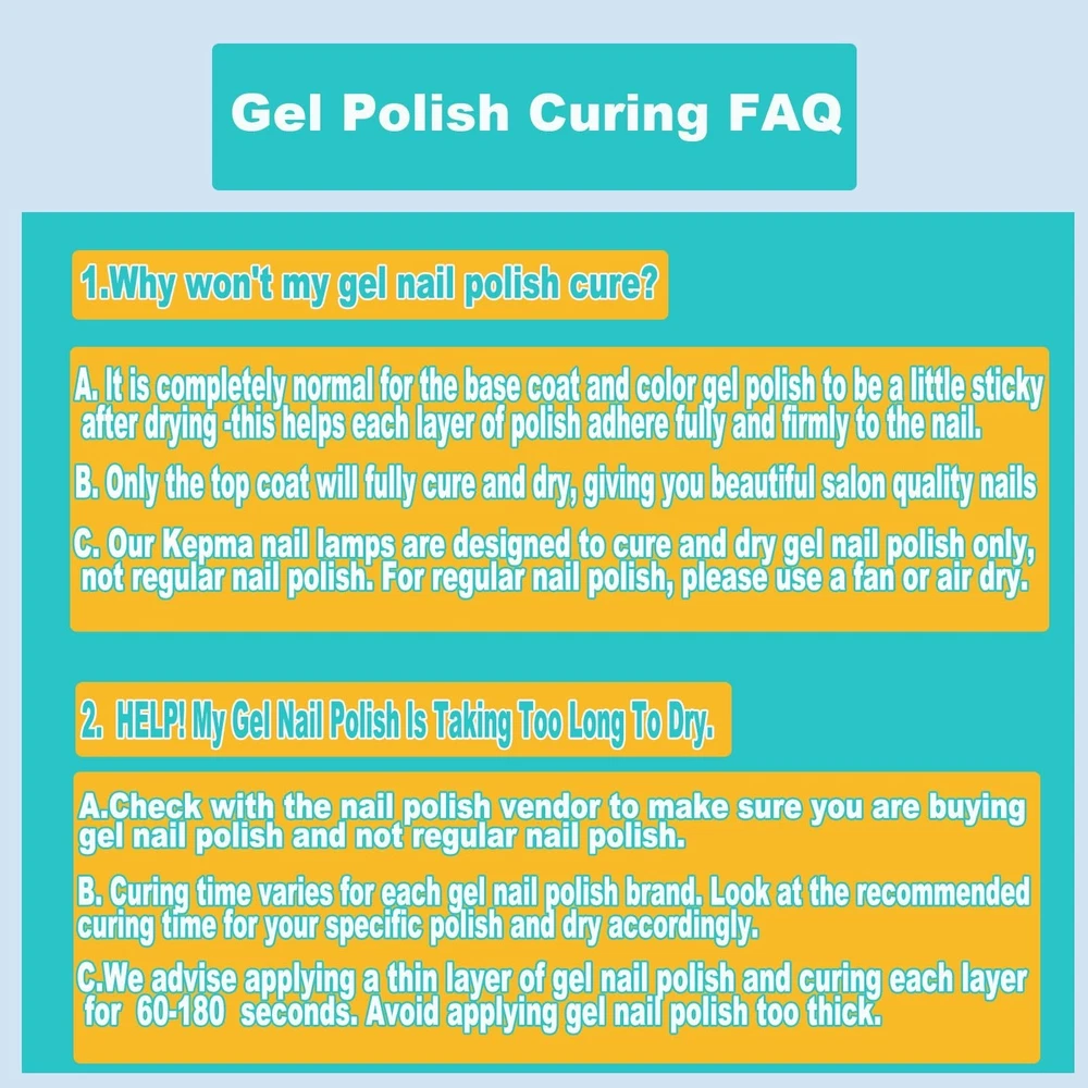 Kepma UV LED Nail Dryer Mini lamp Portable Curing Light for Gel Nail Polish,6w(White) Product Details Finish Type: Polished Base Material: Resin Bulb Base: Prong Product Dimensions: 3.54"D x 5.12"W x 0.79"H Item Weight: 0.11 Pounds Is Discontinued By Manufacturer : No Product Dimensions : 5.12 x 3.54 x 0.79 inches; 1.76 ounces Date First Available : January 10, 2019 Manufacturer : Kepma Customer Reviews: 3.9 3.9 out of 5 stars 16,469 ratings Finish Type: Polished Base Material: Resin Bulb Base: Prong Product Dimensions: 3.54"D x 5.12"W x 0.79"H Item Weight: 0.11 Pounds Lamp Type: Nail Dryer Shade Color: White Shade Material: Resin Switch Type: Touch Style: Minimalist Brand: Kepma Color: White Special Feature: Rechargeable Light Source Type: LED Material: Resin Room Type: Office Recommended Uses For Product: Curing Power Source: Corded Electric Number of Light Sources: 6 Connectivity Technology: USB Included Components: Power Cable Is Waterproof: TRUE Bulb Shape Size: A19 Mounting Type: Tabletop Wattage: 6 watts Number of Items: 1 Lighting Method: LED Control Method: Touch Indoor/Outdoor Usage: Indoor Water Resistance Level: Waterproof Installation Type: Nail On Number of Pieces: 1 Efficiency: High Efficiency Voltage: 5 Volts (DC) Is Cordless?: No UPC: 886319224517 686494436961 686494436862 Size: 3 Piece Set Manufacturer: Kepma Shade Height: 0.79 Inches Part Number: UVL Item Weight: 1.76 ounces Is Discontinued By Manufacturer: No Finish types: Polished Special Features: Rechargeable Batteries Included?: No Batteries Required?: No Wattage: 5 Watts Date First Available: January 10, 2019 1.Attention Please: The lamp works well with GEL nails but not for TRADITIONAL nail polish Dual light sources (wavelength 365nm+405nm), makes it works fastly with gel nail polish(top coat/base coat/color gel),gel stickers and uv resin,but not for traditional nail polish. The traditional nail polish needs to be air dried rather than curing by uv nail lamp. 2.Mini Size Mini size(3.54"D x 5.12"W x 0.79"H), 0.11 lb light weight, can be easy to put in your makeup bag, handbag even in a wallet. 3.Timer Design: 3 Timer Settings : 60s, 180s and "Stay on" .Press ON/OFF button once for curing 60 seconds, second press for 180 seconds.Press and Hold for 3-4 seconds, it stays on. Warm Tips: The nail lamp is not rechargeable. When using the product, please connect the attached cable to a mobile powerbank or the other USB socket. 4.Pretect Your Eyes adn Skin Comparing with other products, its light is closer to white light, has no harm to eyes and skin. Fashionable and durable 50000hrs lifetime, ideal for personal use and best gift for friends. 5.Warranty100% customer satisfaction is our pursuit, we can provide 12 months warranty.Warm Tips:Please notice the lamp size before placing an order . It is normal for gel nail polish to feel sticky after curing.DO NOT WIPE. It is recommended to apply as thin a coat as possible when applying gel nail polish. The curing time will be shorter.