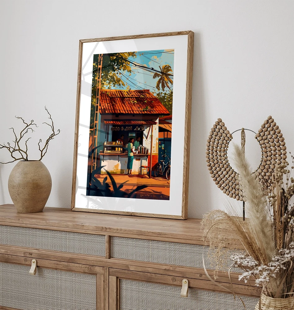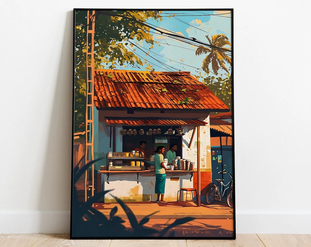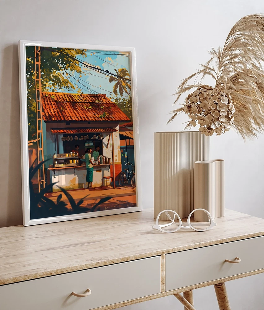 Kerala Chai Shop Painting Tropical Village Art Print Tea Shop Wall Art Decor Material: Premium luster photo paper Print type: Inkjet printing One side printed + The finish provides the highest possible resolution and color saturation + Lasts up to 200 years in color and 400 years in black-and-white + Printed on high-quality resin-coated photo base paper medium + Posters can be hung with double-sided tape, tacks, or framed + Hand washing with a gentle cry cloth is recommended for extended durability I will hand select the best choice of paper for your chosen design to ensure top quality results for a beautiful, bright and luxurious print. All prints are sealed in cellophane slips for protection during transportation, and are shipped in a protective cardboard envelope.