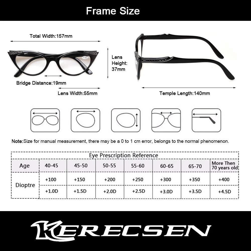Product Description Specification: Width of the forehead frame :157mm/ 6.18" (approx.) Lens Height:37mm/ 1.46" (approx.) Lens Width : 55mm/2.17" (approx.) Leg Length :140mm/5.51" (approx.) Color:Pink Blue Black Tortoise. Please specify the frame color and lens strength when pay for this.Thanks! Classic-shaped frames, look good on any face. help glasses fit your face Material : PC Frame, AC Lens,Head Size:Narrow to Medium Diopter available: +50 +100 +150 +200 +250 +300 +350 +400 Other diopter: +75+125 +175 +225 +275 Note: Due to the difference between different monitors, the picture may not reflect the actual color of the item. Thank you! Size for manual measurement, there may be a 0 to 1 cm error, belongs to the normal phenomenon. Package includes: 4 x Reading Glasses If you have any problems with our items or services, please feel free to contact us . We will do our best to solve any problems and provide you with the best customer services. Your Glasses come with our 90 Day Money Back Guarantee and 1-Year Manufacturer's Warranty. Thank you