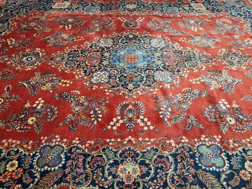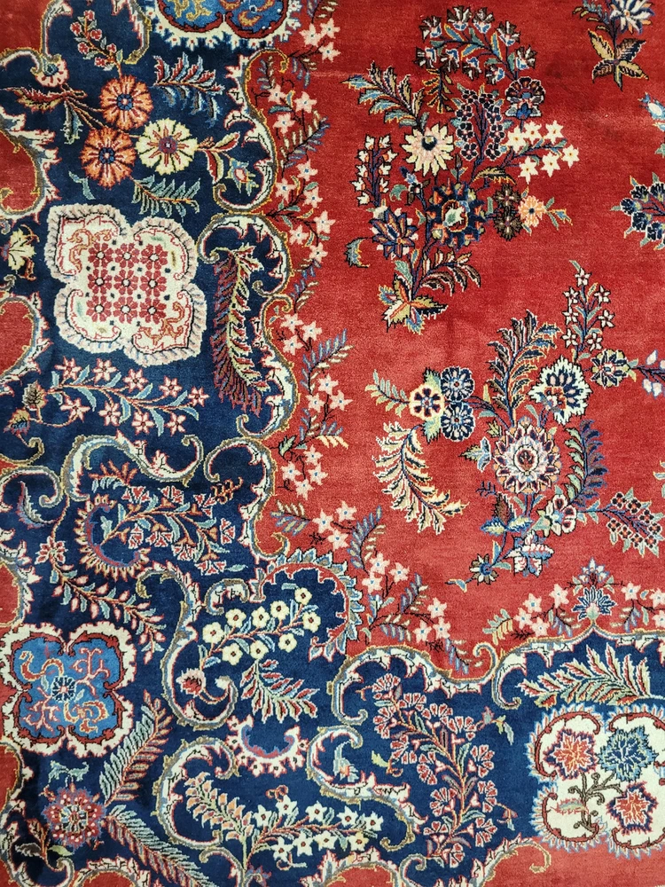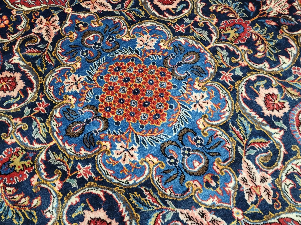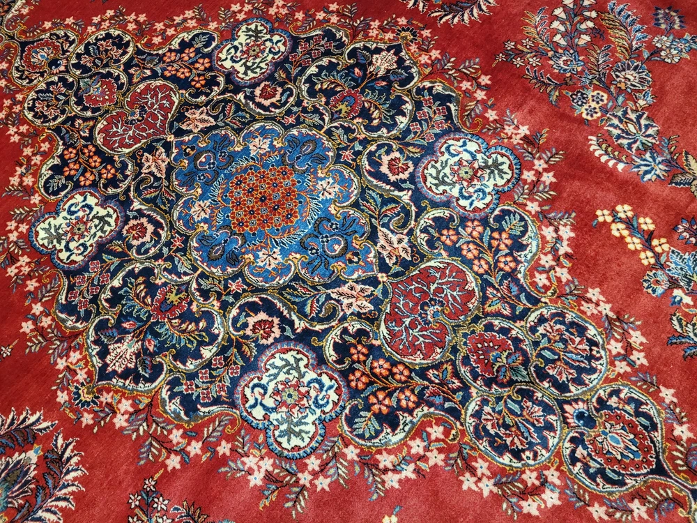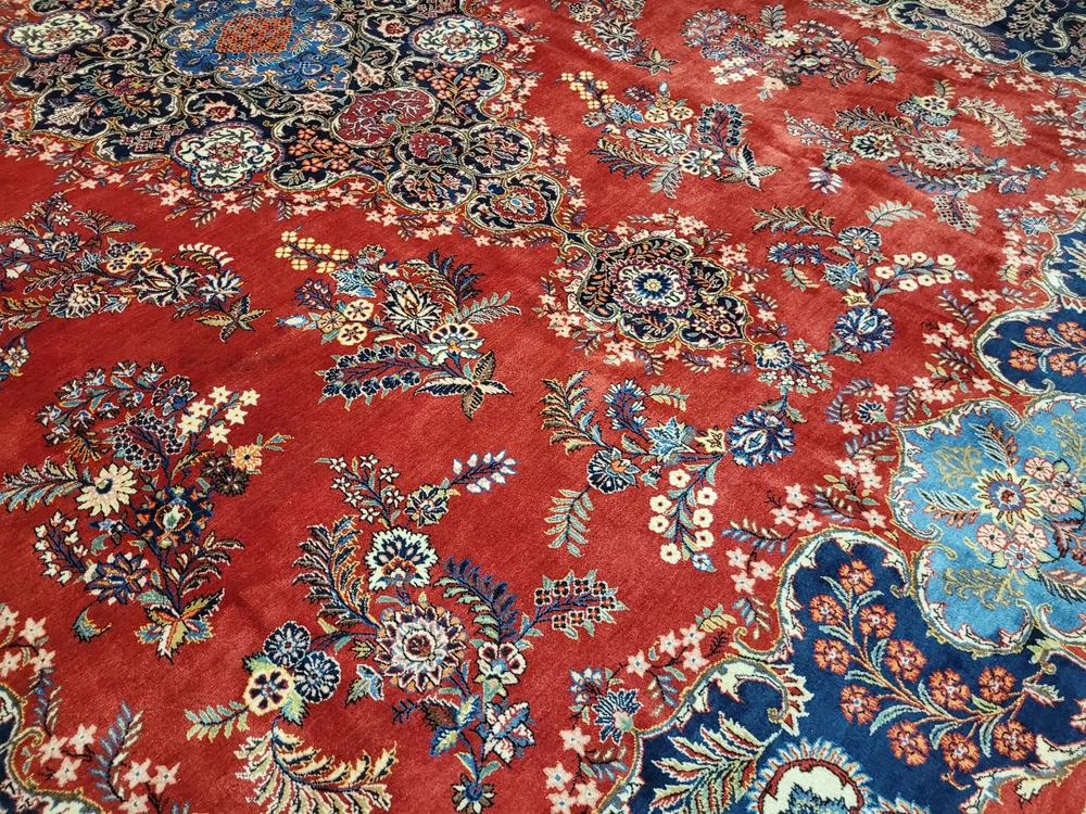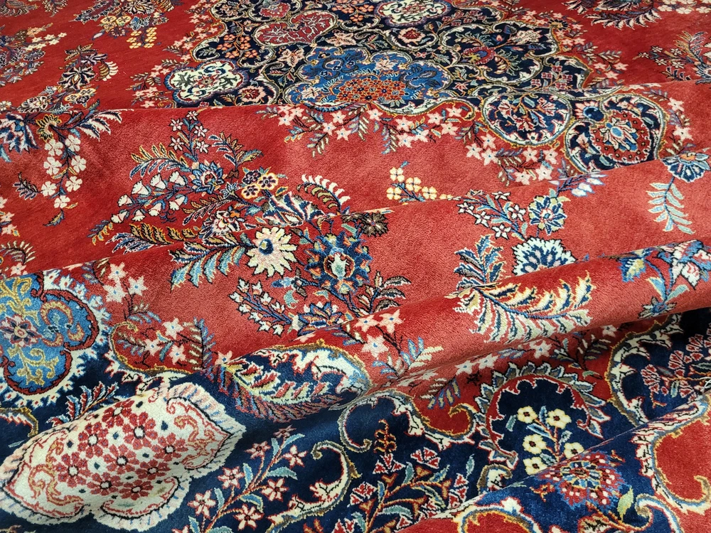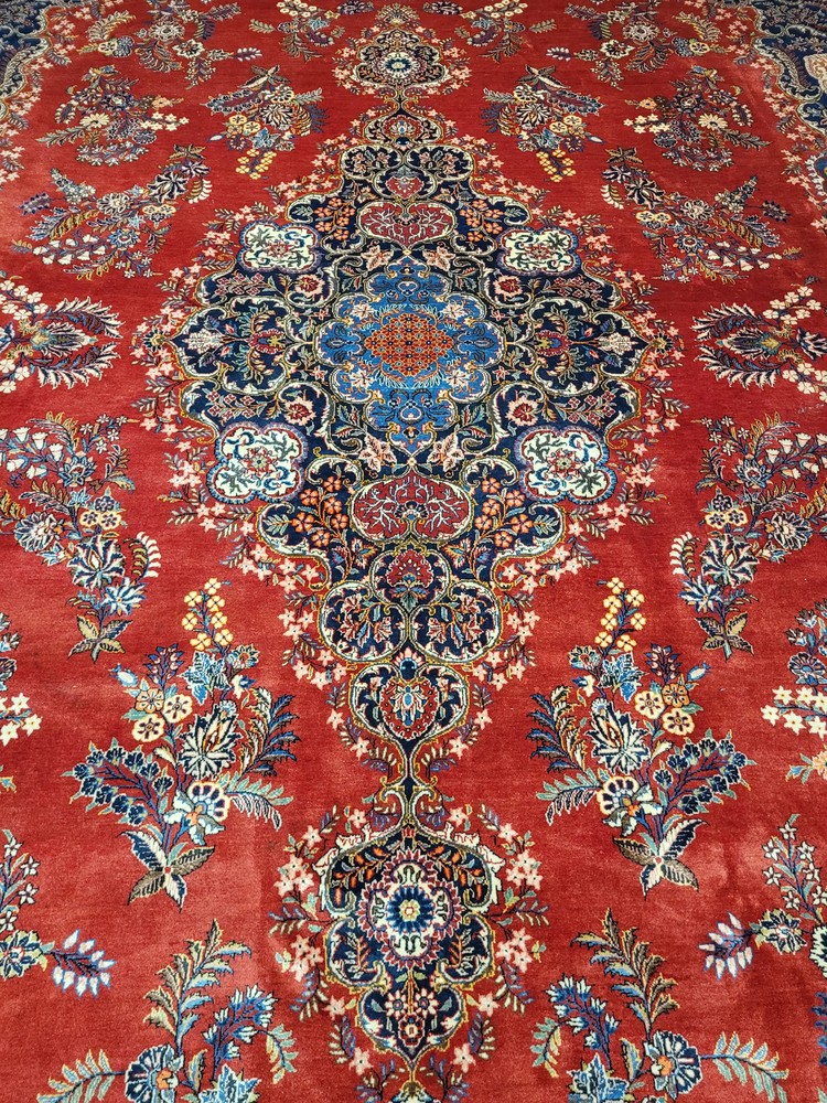 Herzlich willkommen, angeboten wird ein prachtvoller Keschan Teppich aus feinster Korkwolle, handgeknüpft in meisterlicher Qualität. Das leuchtend rote Mittelfeld ist mit einem zentralen, reich ornamentierten Medaillon geschmückt, umrahmt von geschwungenen Blütenranken, Palmetten und kunstvoll gestalteten Arabesken. Eine tiefblaue Hauptbordüre mit floralem Wechselmotiv fasst das Gesamtbild elegant ein – ein Klassiker der persischen Knüpfkunst in eindrucksvoller Größe. Artikelnummer: GJH25/235 Maße: 415 × 320 cm Gewicht: ca. 43 kg Details: Material: Korkwolle, handgeknüpft Knüpfung: fein, dicht und präzise gearbeitet Farben: Rot, Dunkelblau, Hellblau, Beige, Grün, Goldgelb, Akzente in Rosa Design: zentrales Medaillon auf rotem Grundfeld, florale Muster mit reicher Bordüre Florhöhe: mittelhoch, weich und gleichmäßig geschoren Rückseite: saubere, feste Knüpfstruktur, hohe handwerkliche Präzision Zustand: Sehr guter, gepflegter Zustand mit kräftigen Farben und gleichmäßigem Flor. Die Bilder sind Teil der Zustandsbeschreibung. Versand: Versicherter Versand weltweit per DHL, UPS oder GLS.