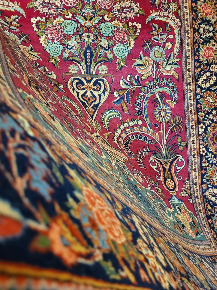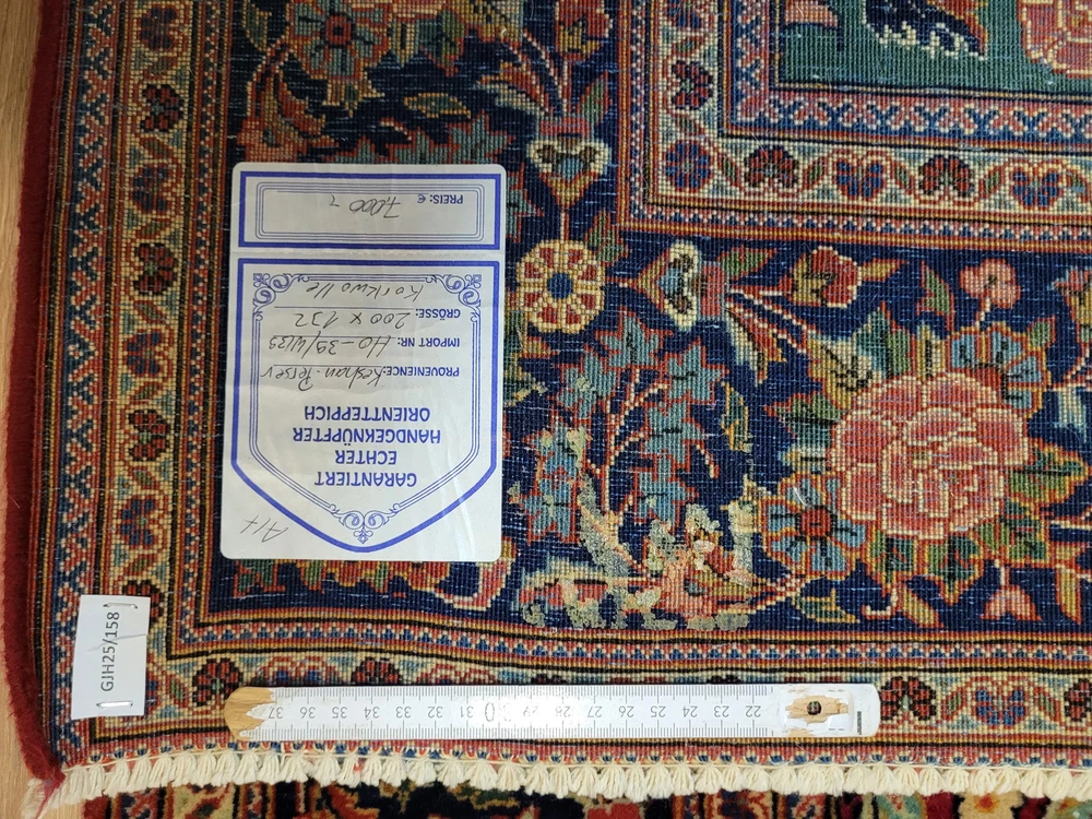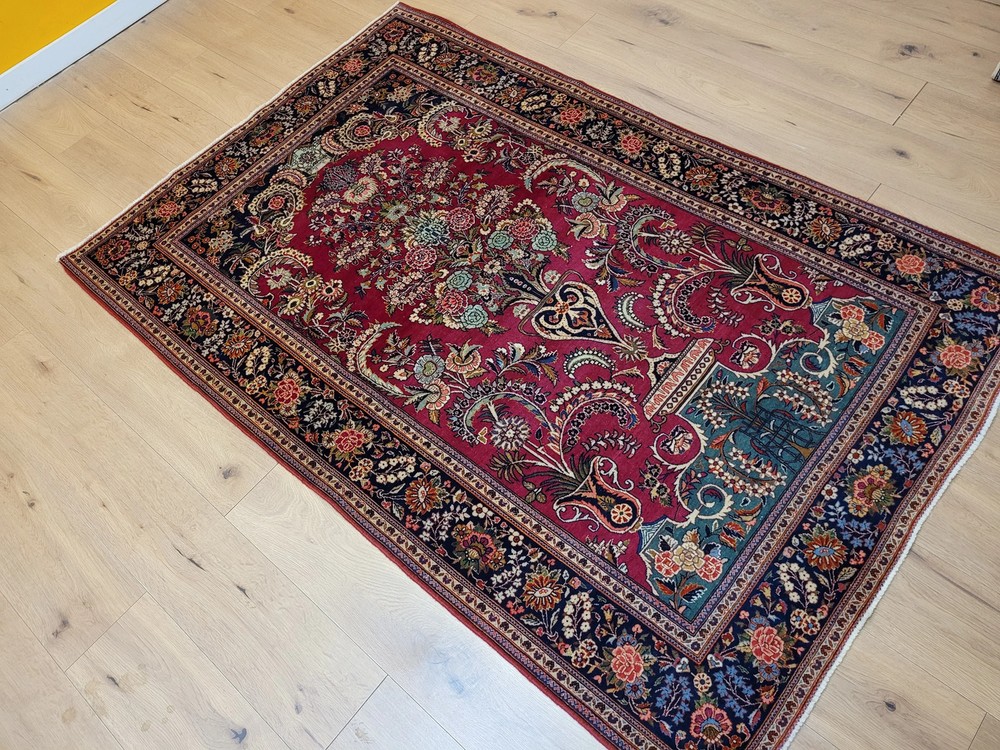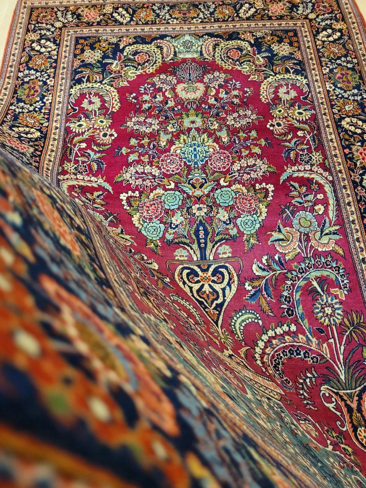 Herzlich willkommen, angeboten wird ein kunstvoller Keschan Teppich aus feiner Korkwolle, handgeknüpft in detailreicher Ausführung. Das Hauptmotiv zeigt eine prachtvolle Vase, aus der sich ein reich gefüllter Blumenstrauß erhebt. Die Komposition ist symmetrisch angelegt und von dekorativen Blütenranken umgeben, die in kräftigen Farben erstrahlen. Artikelnummer: GJH25/158 Maße: 200 × 132 cm Details: Material: Korkwolle, handgeknüpft Knüpfung: fein gearbeitet mit klarer Linienführung Farben: leuchtendes Rot im Fond, dazu Blau, Grün, Gelb, Beige, Schwarz und Rosé Design: Großes Vasenmotiv mit blühendem Strauß im Zentrum Reiche florale Arabesken mit geschwungenen Ranken und Blüten Bordüre mit umlaufendem Blütenfries in kontrastreicher Gestaltung Verarbeitung: hochwertige Knüpftechnik, harmonische Farbkomposition und detailgenaue Ornamentik Verwendung: repräsentativer Teppich für Wohn- oder Empfangsräume, dekoratives Sammlerstück Zustand: Sehr guter, gepflegter Zustand. Die Bilder sind Teil der Zustandsbeschreibung. Versand: Wir versenden per GLS, UPS und DHL versichert weltweit.