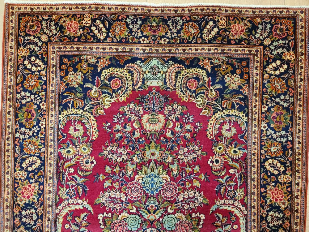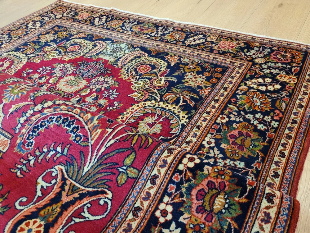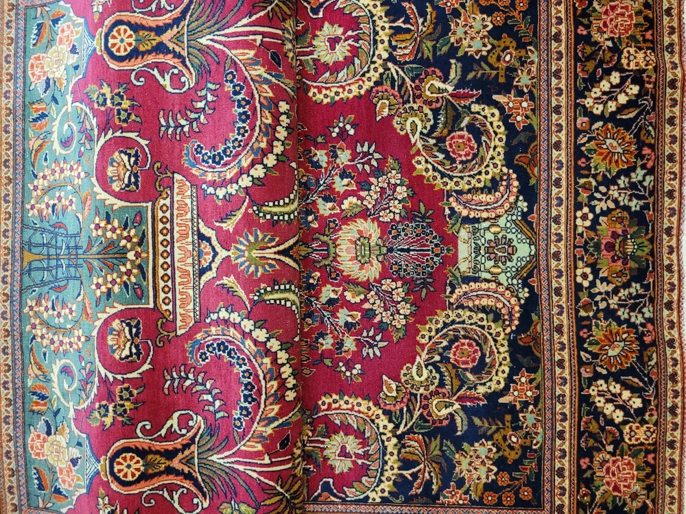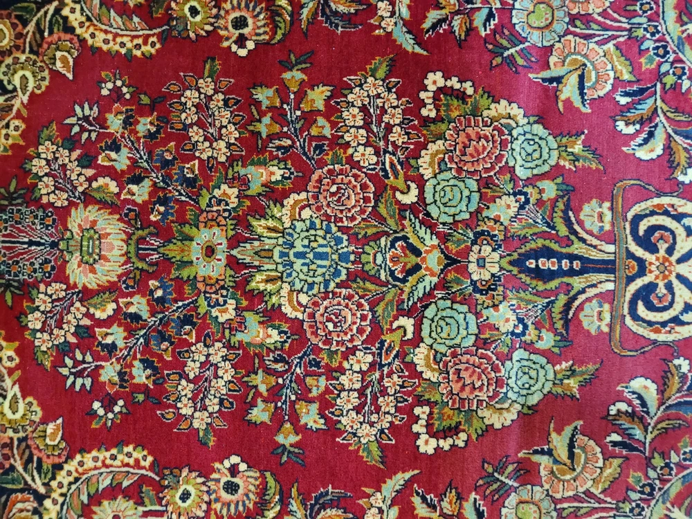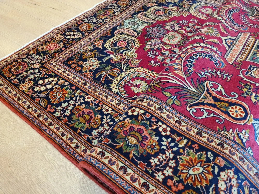 Herzlich willkommen, angeboten wird ein kunstvoller Keschan Teppich aus feiner Korkwolle, handgeknüpft in detailreicher Ausführung. Das Hauptmotiv zeigt eine prachtvolle Vase, aus der sich ein reich gefüllter Blumenstrauß erhebt. Die Komposition ist symmetrisch angelegt und von dekorativen Blütenranken umgeben, die in kräftigen Farben erstrahlen. Artikelnummer: GJH25/158 Maße: 200 × 132 cm Details: Material: Korkwolle, handgeknüpft Knüpfung: fein gearbeitet mit klarer Linienführung Farben: leuchtendes Rot im Fond, dazu Blau, Grün, Gelb, Beige, Schwarz und Rosé Design: Großes Vasenmotiv mit blühendem Strauß im Zentrum Reiche florale Arabesken mit geschwungenen Ranken und Blüten Bordüre mit umlaufendem Blütenfries in kontrastreicher Gestaltung Verarbeitung: hochwertige Knüpftechnik, harmonische Farbkomposition und detailgenaue Ornamentik Verwendung: repräsentativer Teppich für Wohn- oder Empfangsräume, dekoratives Sammlerstück Zustand: Sehr guter, gepflegter Zustand. Die Bilder sind Teil der Zustandsbeschreibung. Versand: Wir versenden per GLS, UPS und DHL versichert weltweit.