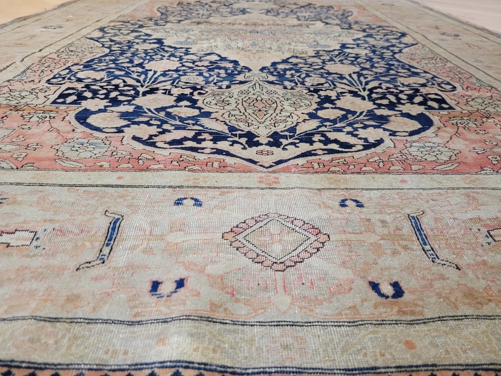 Herzlich willkommen, angeboten wird ein seltener, fein gearbeiteter Keschan Teppich mit klassischem Zentralmedaillon und floralem Dekor. Dieses handgeknüpfte Meisterstück überzeugt durch seine harmonische Farbgebung, detailreiche Knüpfkunst und elegante Ausstrahlung – ein beeindruckendes Beispiel traditioneller Teppichkunst. Artikelnummer: GJH25/299 Maße: 190 × 132 cm Details: Material: Korkwolle auf Baumwolle, handgeknüpft Knüpfung: fein und präzise, dichte Struktur Farben: Nachtblau, Rosé, Beige, Himmelblau, Altgold Design: Zentralmedaillon mit symmetrischem Aufbau Florale Ranken und Palmetten im Fond Bordüre mit kunstvoll verschlungenen Blütenmustern Harmonischer Farbverlauf mit feinen Schattierungen Verarbeitung: Hervorragende Handarbeit mit ausgewogener Balance zwischen Ornamentik und Farbe. Der Teppich zeigt typische Merkmale älterer Keschan-Knüpfkunst: zarte Linienführung, klare Medaillonform und florale Eleganz. Zustand: Guter, gepflegter Erhaltungszustand mit authentischer Patina. Leichte Gebrauchsspuren, altersgemäß schön erhalten. Die Fotos sind Bestandteil der Zustandsbeschreibung. Versand: Versicherter weltweiter Versand mit DHL, UPS oder GLS.
