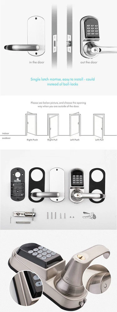 Safe Mechanical Home Keyless Digital Door Lock Set Entry Code Keypad Combination Features: Cartoon: the Mifare-1 card, open interfaces, campus card, bus cards can directly set unlock card High purity silicone: wear resistance, stable,Durable, anti-collision Simplified easy installation, make your home and property safe Simplified easy installation Easy to change batteries User deleted individually ANSI Grade 2 / ROHS certified Keypad Shutdown: 10s if a code is wrongly input 3 times Specification: Material: Zinc Alloy, Stainless Steel Handle: Left handle, Right handle Standard Mortise: Single Latch Door Thickness Requirement: =3.8cm~5.0cm (Single), over 5.0cm, please contact us for tailor-made Door frame≥110mm(Thickness different doors) Locking Method: Autom Safe Mechanical Home Keyless Digital Door Lock Set Entry Code Keypad Combination Welcome~ Safe Mechanical Home Keyless Digital Door Lock Set Entry Code Keypad Combination Features: Cartoon: the Mifare-1 card, open interfaces, campus card, bus cards can directly set unlock card High purity silicone: wear resistance, stable,Durable, anti-collision Simplified easy installation, make your home and property safe Simplified easy installation Easy to change batteries User deleted individually ANSI Grade 2 / ROHS certified Keypad Shutdown: 10s if a code is wrongly input 3 times Specification: Material: Zinc Alloy, Stainless Steel Handle: Left handle, Right handle Standard Mortise: Single Latch Door Thickness Requirement: =3.8cm~5.0cm (Single), over 5.0cm, please contact us for tailor-made Door frame≥110mm(Thickness different doors) Locking Method: Automatic Dynamic Power Consumption: 150-300mA Working Temperature: -30C to 70C Working Humidity: 10%-97% Card read distance: 3cm Static current: ≤30uA Working current: ≤200mA Unlock way: Card, Code, Code+card, Mechanical key Code length: 4-8 digits User capacity: 200 Users Power Supply: 4X1.5v AA Alkaline Batteries (Not included) Payment Delivery details Terms of sales About us Contact us Payment We accept ebay payment 。 Fees such as import duties, taxes are not included in the item price or shipping costs. These charges are the buyer's responsibility. Delivery details Shipping: 2-9 working days to: USA Terms of sales We maintain high standards of excellence and strive for hundred percent customer satisfaction. Feedback is very important to us. We hope that you contact us immediately before you give neutral or negative feedback, so that we can address your concerns. It is impossible to address issues if we do not know about them! About us Your satis faction is our ultimate goal. We work hard to earn your trust and future business. Our certified technicians have tested each item before shipping. The unit comes with 1 year limited warranty on all manufacturing defects. a) If you receive a defective item, you may return it or ask for a discount. Please contact us within 14 days after you receive the package. b) What you returned must be intact and in its original packaging as re? u. Customer is responsible for shipping costs of the returned item. c) We will cover the cost of shipping back t with the shipping rate indicated in the registration page. We will send you a new unit or refund the full payment you paid. Thank you. Contact us Business Hour Business Hour: Monday To Friday: 8:30 AM to 5:00 PM (Beijing China time) Due to time zones, our reply to your questions may not be immediately. But within above working time, we will reply your email within 24 hours. If it's non-workdays, please kindly be patient and wait till Monday. Please contact us with ebay message. Please feel free to contact us if you have any questions. Monday To Friday: 8:30 AM to 5:00 PM (Beijing China time) Due to time zones, our reply to your questions may not be immediately. But within above working time, we will reply your email within 24 hours. If it's non-workdays, please kindly be patient and wait till Monday. Please contact us with ebay message. Please feel free to contact us if you have any questions.
