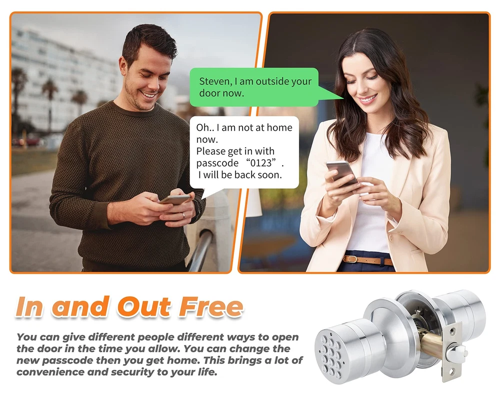 Keyless Electronic Entry Door Knob, Keypad Smart Door Knob, Interior Door Handle with Lock, Automatic Locking, Battery Backup, Backlight, Easy Installation, Great for Home, Hotel and Office 【Easy to Install and Use】 This digital door knob is very easy to install. All you need is a screwdriver and you can install this lock in 10 minutes. This keypad door lock is suitable in most standard doors in the United States.11 【Safe & Useful】 The keypad door knob enter lock is up to 8 changeable codes. Anti spy code encryption. With automatic locking retractor, the door will automatically lock behind you after opening for 3 seconds. IP65 weatherproof,works great in any weather. 【Multi-Function】 The Smart door knobs can be used all year round and has a low power alert mode. An emergency power charger is included in the package, and the lock has a backup battery port that can be recharged at any time in case the battery runs out. 【Smart Keyboard】 The lock key is backlit to prevent password peeking. And the lock button lights up so you can see the numbers clearly when you use lock at night. 【Wide Applicability】 There is a wide range of application of this digital door knob and it can be widely used in all kinds of doors of different materials. This smart lock is suitable for different scenarios, bedroom, study, garage, basement, office, hotel, Apartment, etc.