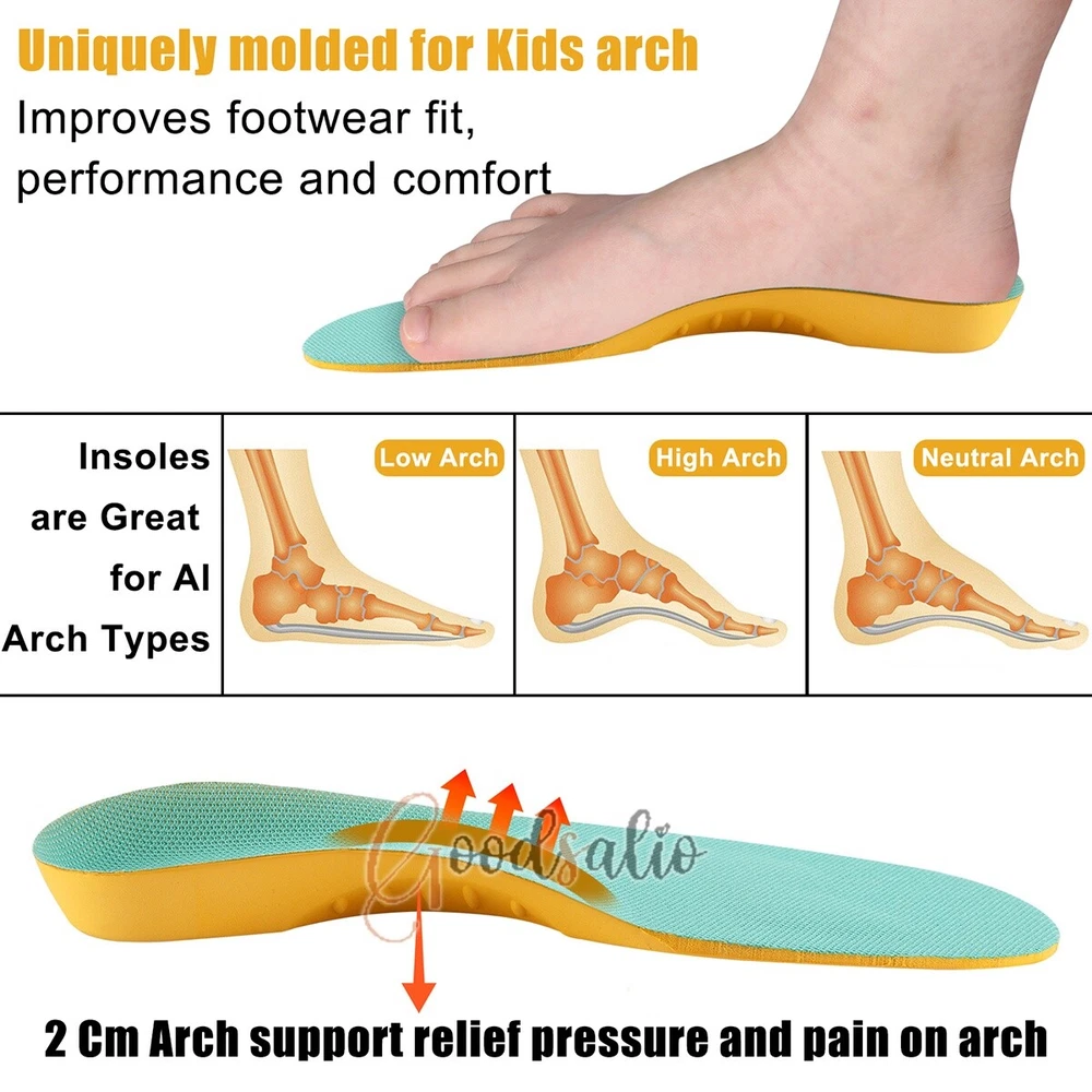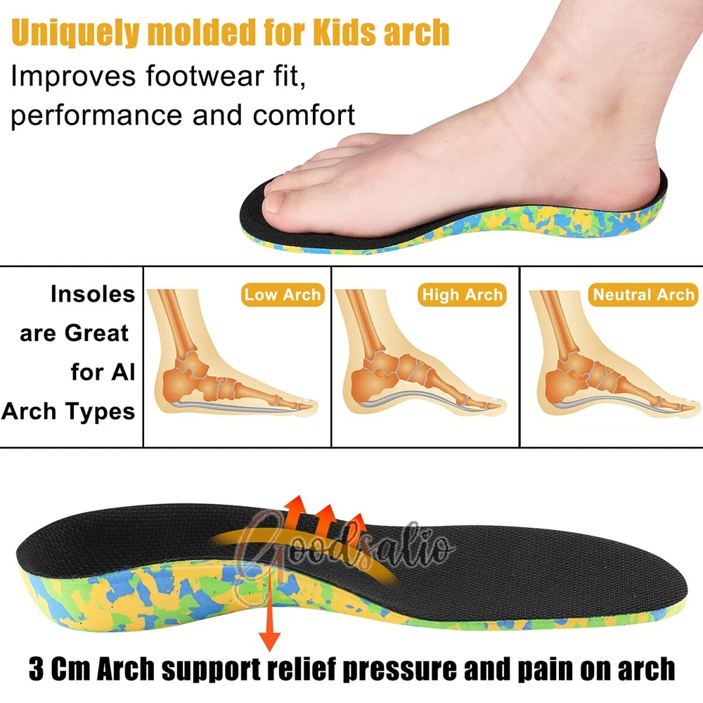 Kids Children Orthopedic Insoles Shoes Flat Foot Arch Support Anti-Slip Sport US ★SPECIAL TIPS: √ Ship within 24 hours Via USPS from NJ ,USA √ 100% New & Excellent Quality √ Professional Customer Service √ Strictly QC, Each set was fully tested before shipping √ Offer delivery with Tracking Number If not 100% satisfied with our products, no-questions asked, we offer 30-day free return & money back. Product Feature 1.Shock Absorbing Pads: The insoles are set with shock absorbing pads, which can absorb the impact generated by the body in the process of movement or walking, reduce the impact and wear on the joints, and protect the health of joints. 2.EVA Material: The insoles are made of EVA material, which is lightweight, soft and flexible, and can provide good cushioning effect and effectively reduce the impact of the ground on the feet. 3.BK Mesh: The insoles contain BK mesh, which has good breathability and ensures air circulation, effectively discharging sweat and moisture from the feet and keeping them dry. 4.U-Shaped Cupped Heel: The insoles feature a U-shaped cupped heel that keeps the heel stable and helps prevent the insole from sliding around in the shoe, improving safety of wear. 5.Yardage Line Design: The insoles are set with a yardage line, you can cut and adjust the size of the insoles according to your actual needs. Product Parameter Material: EVA Color: Yellow+Green/Colorful Size: Yellow+Green:S/M/L/XL Colorful:S/M/L/XL/2XL Products Include 1x Insole (pair)