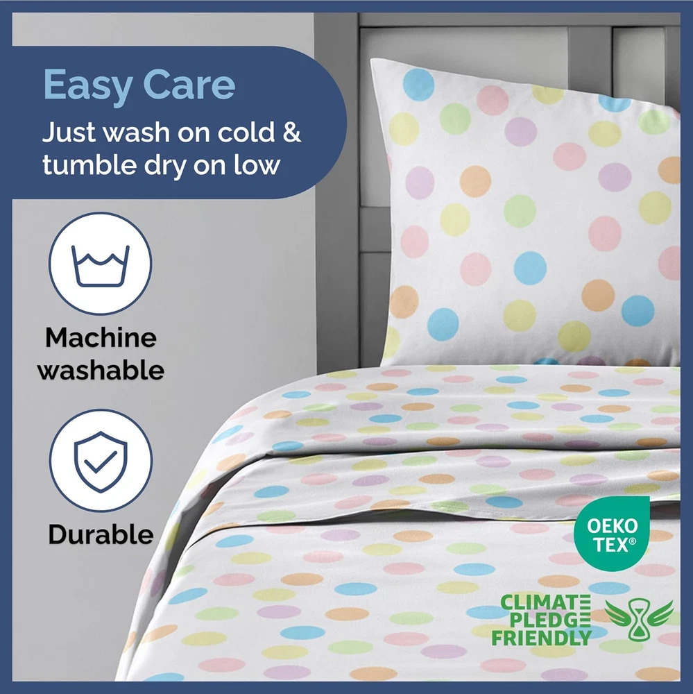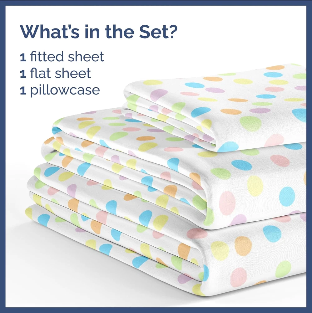Store New Arrivals Add to Favorite View Feedback Contact Kids Dots Twin 3 Piece Sheet Set - Boys, Girls, Teens, Toddler - Easy Fit Deep Pockets - Breathable, Hotel Quality Bedding Sheets - Machine Washable - Wrinkle Free - Cute, Cozy and Soft - CGK Linens Description Item model number KidTwinMultiDots Style Kids Sheet Set Pattern Polka Dot Country of Origin China Theme Children Number of Pieces 3 Unit Count 3.0 Count Pillowcase Quantity 1 Material Microfiber Age Range (Description) Toddler Seasons All Package Dimensions 11.65 x 9.41 x 2.32 inches Closure Type Pull-On Item Weight 1.81 pounds Special Feature Wrinkle-Free Color 26 - Multicolor Dots Thread Count 200 Included Components Pillowcase, Fitted Sheet, Flat Sheet Product Care Instructions Machine Wash Size Twin FUN, BRIGHT PATTERNS, AND COLORS: CGK sheets are perfect for boys, girls, and toddlers with fun patterns making bedtime more exciting! Your son or daughter will love the vibrant and beautiful patterns, and you will love the quality! SOFT COOL AND COMFY: CGK kids’ sheets fit your child’s bedroom style and offer long-lasting quality. Made with a super soft and breathable microfiber material. Perfect for teens, toddlers, or children excited about their “big kid bed” keeping them cozy and ready for bedtime. OEKO-TEX CERTIFIED ensures that our kids' sheets are non-hazardous and safe for your children and the environment. Designed for your convenience. Bid farewell to wrinkles and ironing. Just wash, dry, and spread! With our fade-resistant quality, the vibrancy remains intact. SHEETS THAT DON’T BUDGE: Active sleeper or playful jumper, CGK sheets are here to stay. With a snug elastic fit, there’s no room for bunching or sliding. Count those sheep without any interruptions! PERFECTLY SIZED FOR YOUR LITTLE ONE: 3-piece Twin-size sheet set. Dimensions tailored to fit: 1 Flat Sheet (66″ x 96″), 1 Fitted Sheet (39″ x 75″), and 1 Pillowcase (20″ x 30″). Every piece is tailored for a snug fit. Product Description The video showcases the product in use. The video guides you through product setup. The video compares multiple products. The video shows the product being unpacked. CGK Ultra Soft Kids Sheets Add to Cart Add to Cart Add to Cart Add to Cart Add to Cart Customer Reviews 4.5 out of 5 stars 3,006 4.5 out of 5 stars 3,006 4.5 out of 5 stars 3,006 4.5 out of 5 stars 3,006 4.5 out of 5 stars 3,006 4.5 out of 5 stars 3,006 Price $28.99 $ 28 . 99 — $28.99 $ 28 . 99 $28.99 $ 28 . 99 $28.99 $ 28 . 99 $28.99 $ 28 . 99 Fits Sizes 8 to 16 Inch mattress 8 to 16 Inch mattress 8 to 16 Inch mattress 8 to 16 Inch mattress 8 to 16 Inch mattress 8 to 16 Inch mattress Easy Care Machine Washable Machine Washable Machine Washable Machine Washable Machine Washable Machine Washable Fade Proof Fade Proof Fade Proof Fade Proof Fade Proof Fade Proof Fade Proof Wrinkle Proof Wrinkle Proof Wrinkle Proof Wrinkle Proof Wrinkle Proof Wrinkle Proof Wrinkle Proof Pillowcase Closure Pillow Stay Firmly in Place Pillow Stay Firmly in Place Pillow Stay Firmly in Place Pillow Stay Firmly in Place Pillow Stay Firmly in Place Pillow Stay Firmly in Place OEKO-TEX Certified Yes Yes Yes Yes Yes Yes ABOUT US We offer the best prices around on high quality products. Our E-store includes media such as books, movies, music and games while offering electronics, toys, sporting apparel, clothing, tools, general home, garden items and more. SHIPPING We are always working hard to ensure your package arrives as soon as possible. Please understand that some factors like weather, high postal traffic, and the performance of shipping companies are outside of our control. We offer free shipping to the lower 48 states and ship within 2 business days of payment, usually sooner. We do not accept P.O. Boxes. Please provide a physical address. For shipping outside of the continental USA, we only use eBay's Global Shipping Program.The item is shipped to KY and then sent to the rest of the world. International customers are responsible for all duties and taxes. Continue to check out in order to calculate costs for shipping the item to your country. Messages regarding eBay's Global Shipping Program MUST be directed at eBay EXCLUSIVELY. RETURNS We offer a 30-Day Return Policy on items which you are not completely satisfied with. You have the option for a full-refund or an exchange of the item. No returns are available on items shipped outside of the USA. PAYMENT We accept PayPal. CONTACT US This page content is yet to come Please ad us to your favorite seller and visit again later Thank You CUSTOMER SATISFACTION We try our very best to make sure every customer is completely satisfied. If there's a problem, message us! We're happy to help. WE ACCEPT Copyright © 2021 AutoDS. | All Rights Reserved