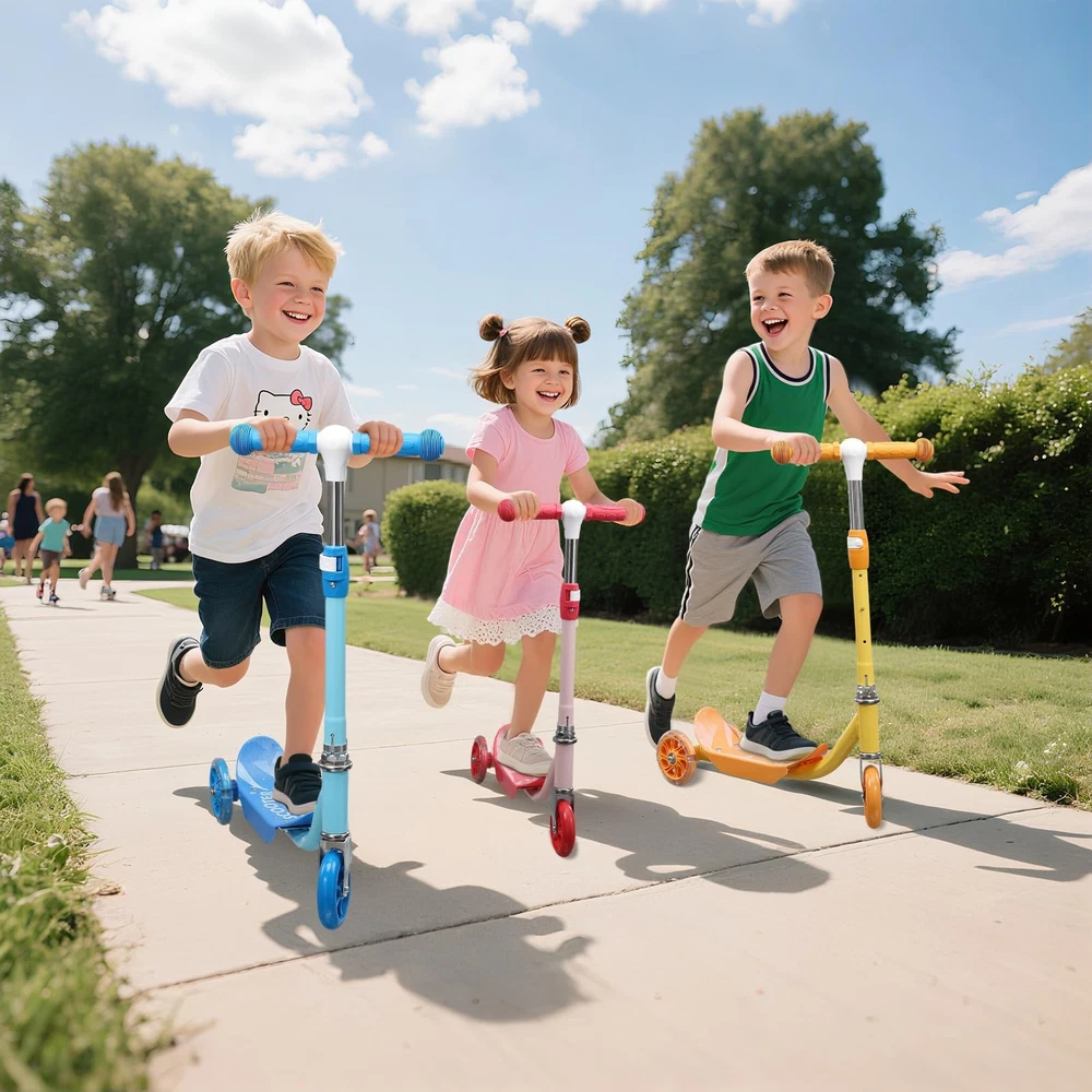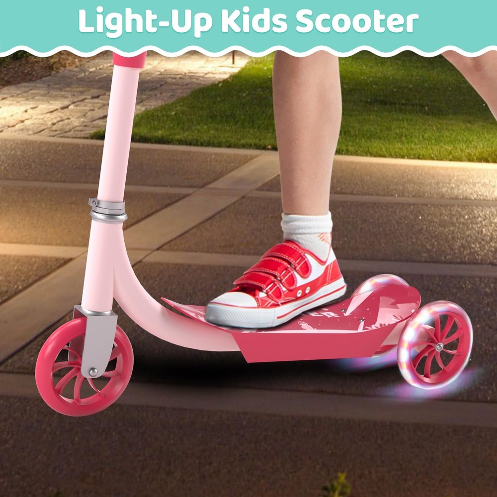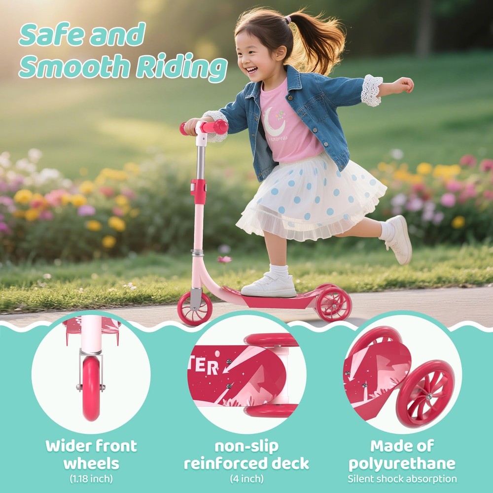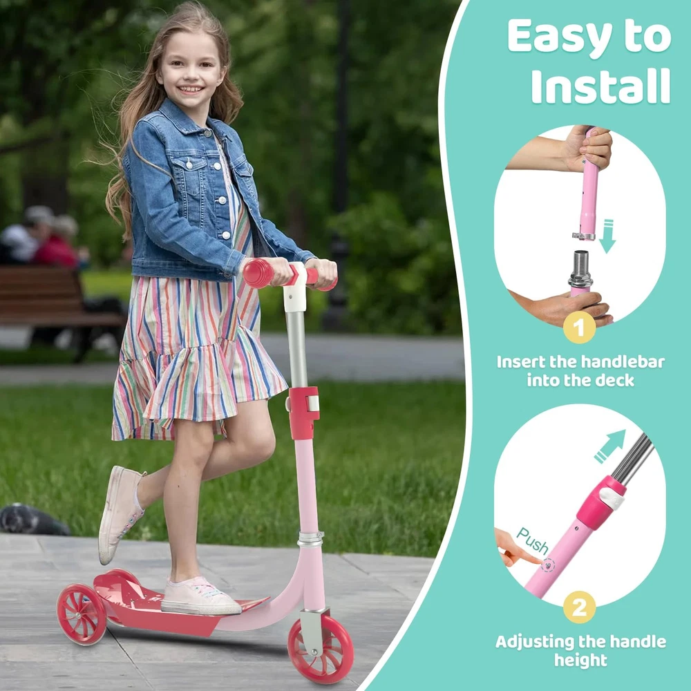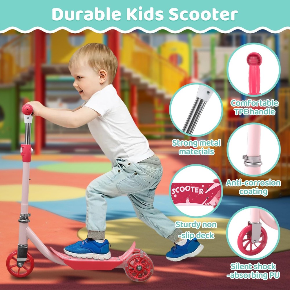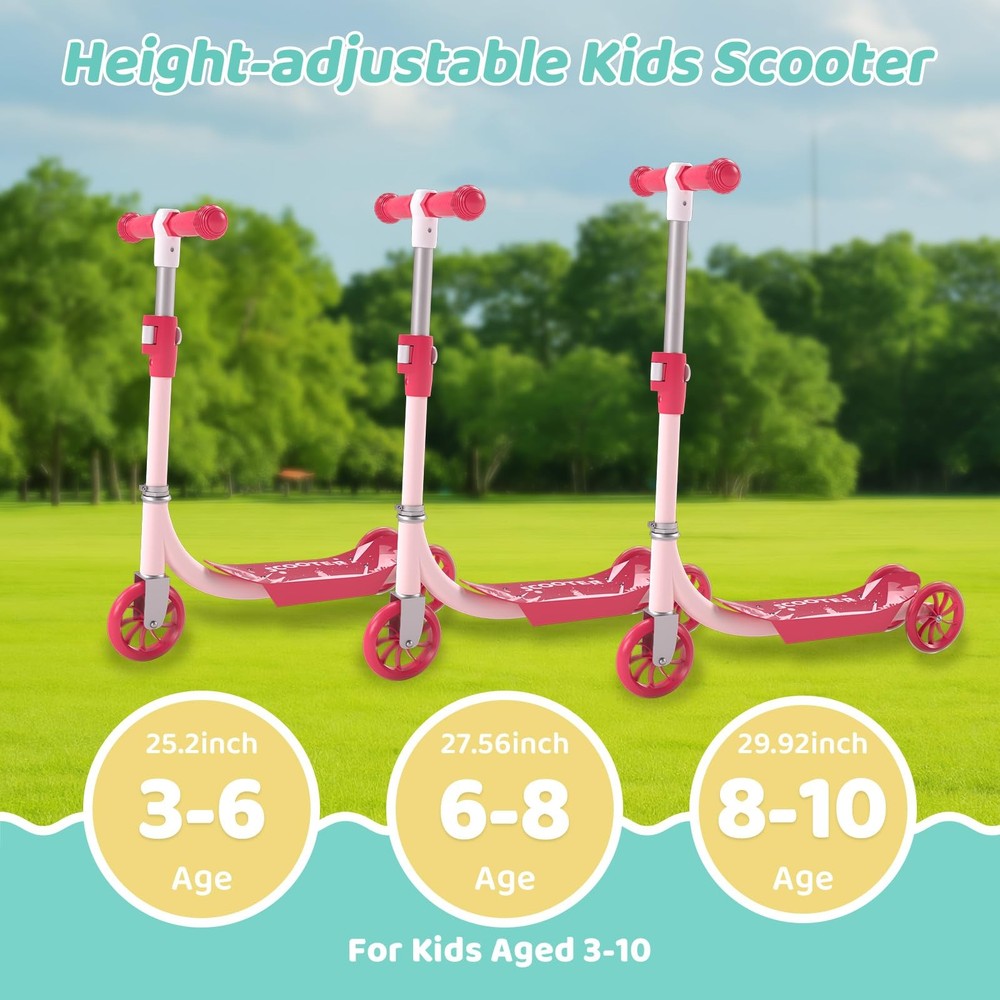 Kids Kick Scooters Safe and smooth riding: The kick scooter provides quiet and smooth riding. The front wheel is 1.18 inches wide, wider than the rear two wheels, providing your child with the necessary stability and support. The wide, non-slip reinforced deck (4 inches) provides ample space for both sitting and standing. It features PU wheels that glide smoothly on indoor and outdoor surfaces, delivering a quiet and enjoyable riding experience. Height-adjustable Kids Scooter: toddler scooter is designed with three height-adjustable options (25.2/27.56/29.92 inches), suitable for children aged 3 to 10. Children can comfortably grip the kid scooter's handlebar. Light-Up Kids Scooter: kick scooter features bright LED rotating wheel lights on the rear two wheels, which glow as they roll. Even in the dark, the kid scooter becomes a captivating sight, giving parents peace of mind. Durable Kids Scooter: This 3 wheel scooters is made from sturdy metal and durable plastic, featuring smooth-rolling PU wheels, adjustable metal T-shaped handlebars, and soft TPE grips for comfort and durability. Easy to install and carry: Simply insert the handlebars into the deck for quick assembly. Its compact size makes it easy to carry, and you can easily fit the scooter for kids into a car trunk or storage area. Premium After-Sales Service: offers a 1-year manufacturer's warranty to ensure your kids scooters is built to last. If you have any questions, please feel free to contact us, and we'll be happy to assist you!