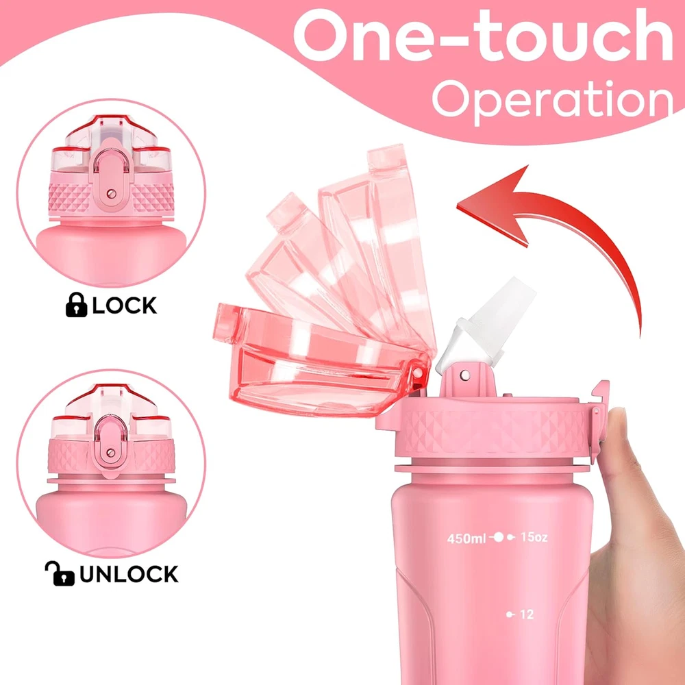 Leak-Proof Design: The lid is completely leak-proof when the tab is locked in place, ensuring no accidental spills or leaks. Easy One-Handed Opening: The straw cap can be quickly opened with just one hand by touching the button for convenience. Dustproof and Portable: The leak-proof lid keeps the bite valve clean and the soft carry strap allows for easy portability. BPA-Free Material: Constructed from BPA-Free Tritan plastic for durability and safety. Suitable for Kids: The round shape and straw feature make it easy for kids to use and drink from. Product Description