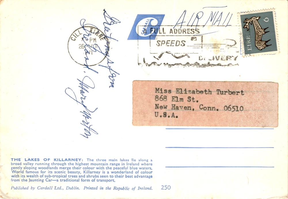 MAKE AN OFFER. THE MORE YOU BUY THE BETTER DEAL I WILL ACCEPT The postcard features a picturesque view of the Lakes of Killarney in Ireland. The lakes are located in a valley surrounded by the highest mountain range in Ireland. The area is known for its stunning beauty, with woodlands blending into the blue waters of the lakes.