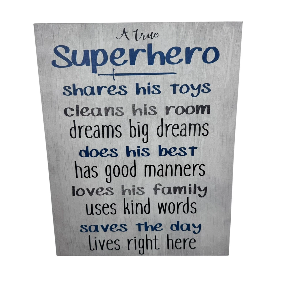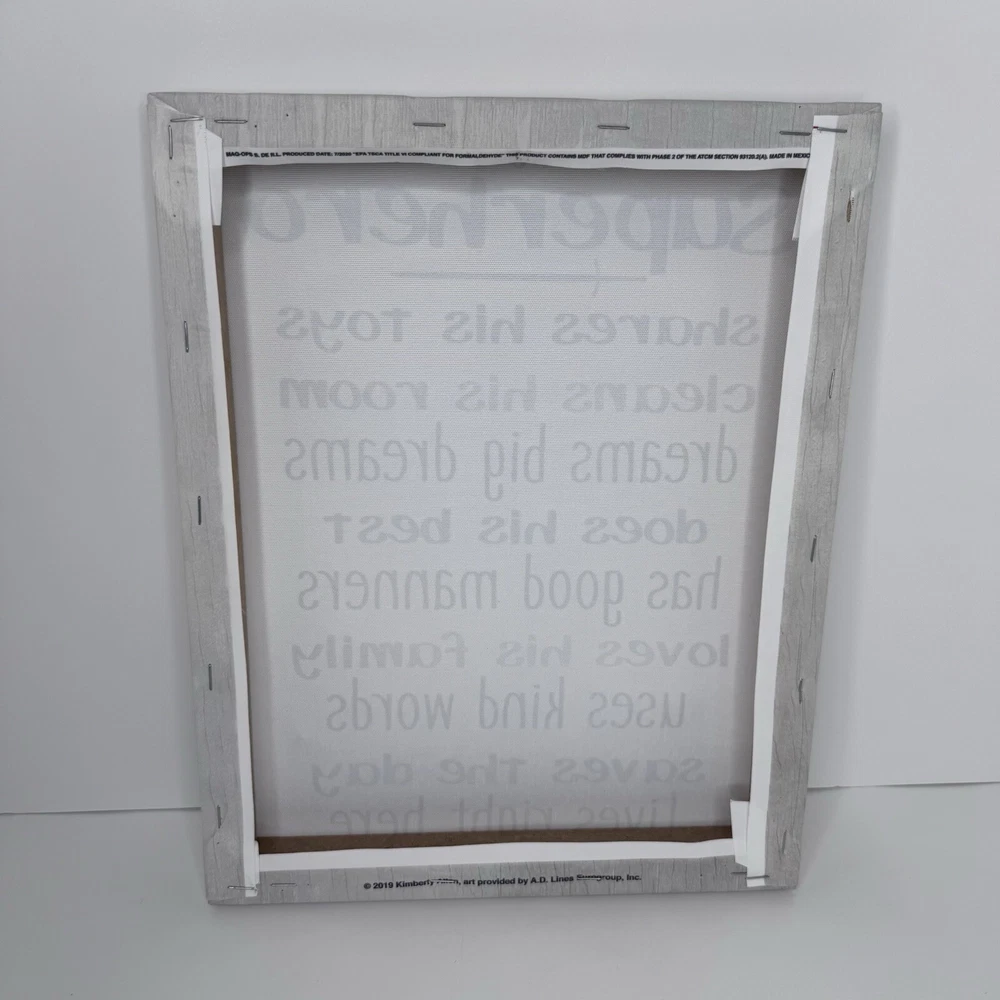 This is a Kimberly Allen superhero canvas wall art featuring a baby boy room decor theme. The canvas print measures 14"x11" and is multicolored. It is designed for any room and showcases artwork related to superheroes. Made of canvas material, this piece adds a playful and artistic touch to the space.