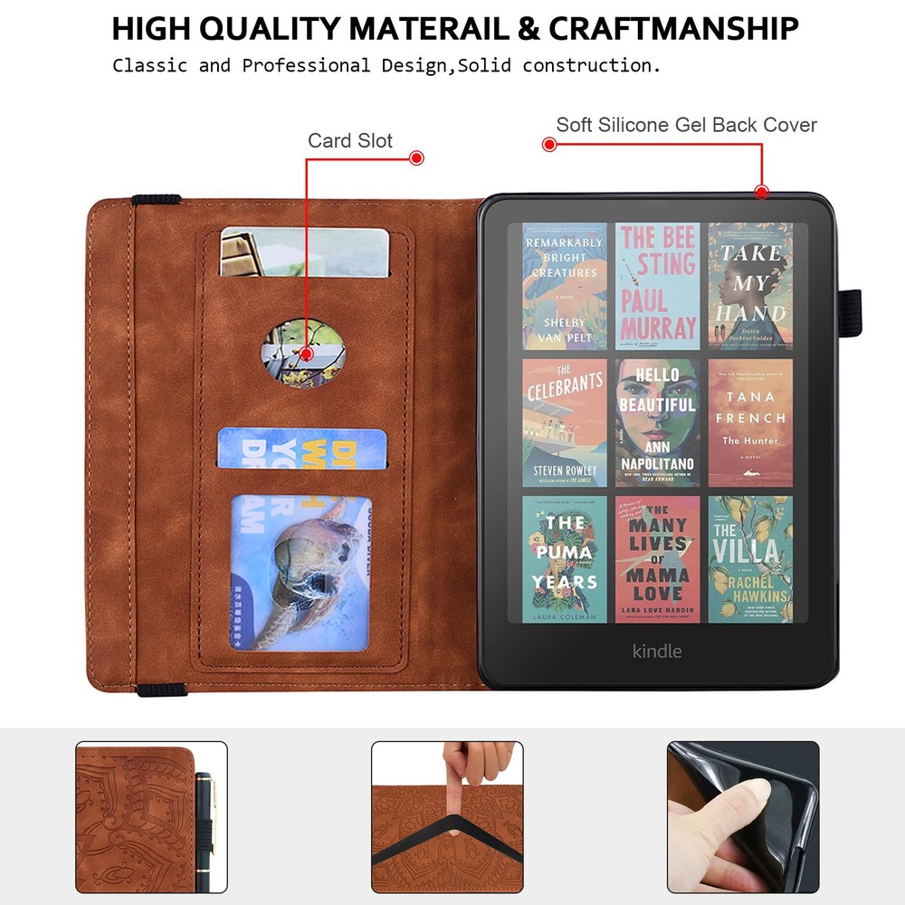 Kindle Paperwhite 2024 & Kindle Colorsoft Signature Edition Folio Case with Credit Card Slots, Elastic Band & Pen Loop Compatibility: ✔ Amazon Kindle Paperwhite 12th Gen 2024 release ✔ Amazon Kindle Paperwhite Signature Edition 12th Gen 2024 release ✔ Amazon Kindle Colorsoft Signature Edition 1st Gen 2024 release - Kindle Size: 5" x 7" x 0.3" (127.6 x 176.7 x 7.8 mm) * Will not work for or any other Kindle model. Features: 🔹 Pretty mandala flower embossed surface, offers exquisite and attractive look for your tablet. 🔹 Easy access to all features and controls (camera, charging port, volume button, etc) without removing the case. 🔹 Elastic strap closure ensures cover securely closed, double fixing your device when fold the front cover backward for reading. 🔹 Front-to-back protective cover case give a full protection for your tablet against dust, water, fingerprints, scratches, shocks and bumps. 🔹 Interior with 2 card holders for carrying your ID/ credit cards/ business cards/ photos. 🔹 Side with an elastic loop holder for stylus. Package List: 1 x Protective Case for Kindle Paperwhite 7 Inch E-book Reader 2024 & Kindle Colorsoft Signature Edition 2024 1 x Stylus Pen (random color) 1 x Cleaning Cloth 📣 Any question about our products, please contact us by email ^_^ [Compatibility]: Exclusively Designed for All-new Amazon 7" Kindle Paperwhite 2024, Kindle Paperwhite Signature Edition (2024 release, 12th generation), and Kindle Colorsoft Signature Edition (Fits 2024 Release Only)(with 7-inch display). Doesn't fit any other model. ✘Not support Auto Wake/Sleep.✘ [Full Protection]: Premium thickening soft TPU back cover and durable front synthetic leather cover help to protect your tablet from daily bumps, scrapes and accidental drops. [Convenient Band & Wallet Feature]: Elastic fixing strap for secure closure and great flexibility. Built-in card slots and pen holder for convenience. [Slim & Portable]: Ultra-thin and lightweight PU leather embossed with Mandala flowers, elegant and beautiful; adds minimal bulk to your tablet, easy to carry. Bonus: 1x stylus pen (random color); 1x cleaning cloth