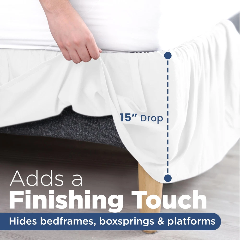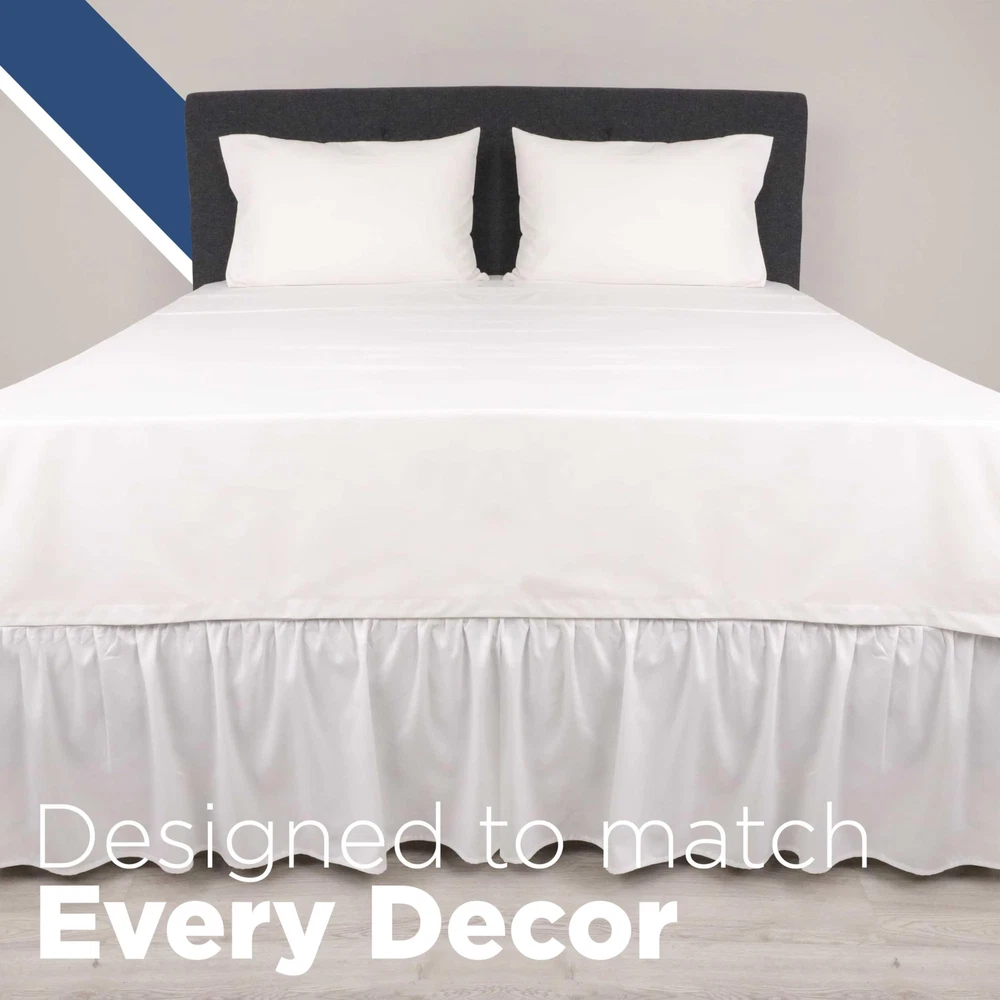 Experience refined elegance and the ultimate bedroom upgrade with a beautiful bed with the Basic Microfiber King Bed Skirt. It adds a soft silhouette to your room with its refined ruffles and its gathered top gives it a luxurious look. Offering cool and classic hues, there’s a color that coordinates with every bedroom and our wide range of bed linens. A great way to conceal unsightly box springs, bed frames, and storage under the bed, the Basic Microfiber Bed Skirt also reduces under-bed dust. It’s made from -resistant, 100-percent brushed Polyester microfiber, meaning it maintains a soft look and feel while being machine washable and dryer safe. It features a 15-inch drop on three sides and a durable, 100-percent Olefin platform to keep it securely in place for a perfect fit. And it’s OEKO-TEX certified, so you’ll sleep with peace of mind knowing the Basic Microfiber Bed Skirt was made without the use of harmful chemicals. Machine wash cold on gentle cycle with similar colors. Use only non-chlorine bleach when needed. Tumble dry low. Do not iron platform. Features a 15-inch drop made of 100-percent Polyester microfiber; 100-percent Olefin platform Soft silhouette undulates with romantic ruffles Brushed for a soft look and resistant. Available in navy, gray, black, and white Machine washable and dryer safe Twin 39-inch W x 75-inch L x 15-inch H Full 54-inch W x 75-inch L x 15-inch H Queen 60-inch W x 80-inch L x 15-inch H King 78-inch W x 80-inch L x 15-inch H. TRANSFORM YOUR SPACE: Add some thrilling frill to your bedroom decor with this ruffle bed skirt. The ruffle bedding adds a sense of rejuvenated style to any space. This king size bed skirt measures 78” x 80” with a 15” drop. STYLISH HIDEAWAY: Storing your things under the bed doesn’t have to be a battle. Hide away the mess with a wrap around bed skirt. Bedskirts fit well under your mattress to keep it in place and add secret storage under your bed. VERSATILITY: A ruffled bedskirt that can be used to up the style, hide unsightly bed legs, or your mess. It comes in different colors and sizes that are bound to fit any decor style, adding a touch of elegance. It is OEKO-TEX STANDARD 100 certified. DURABLE LUXURY: Take your room from plain to polished with this white bed skirt. It is made from 100% brushed microfiber for an extra touch of softness. The flowing silhouette of this bed frame cover is a perfect addition to any bedding. EASY CARE: Machine washable, so you can spend more time relaxing and less time fussing. This bed ruffle makes dressing your bed effortless and easy to maintain. This long bed skirt is made with both style and convenience in mind.