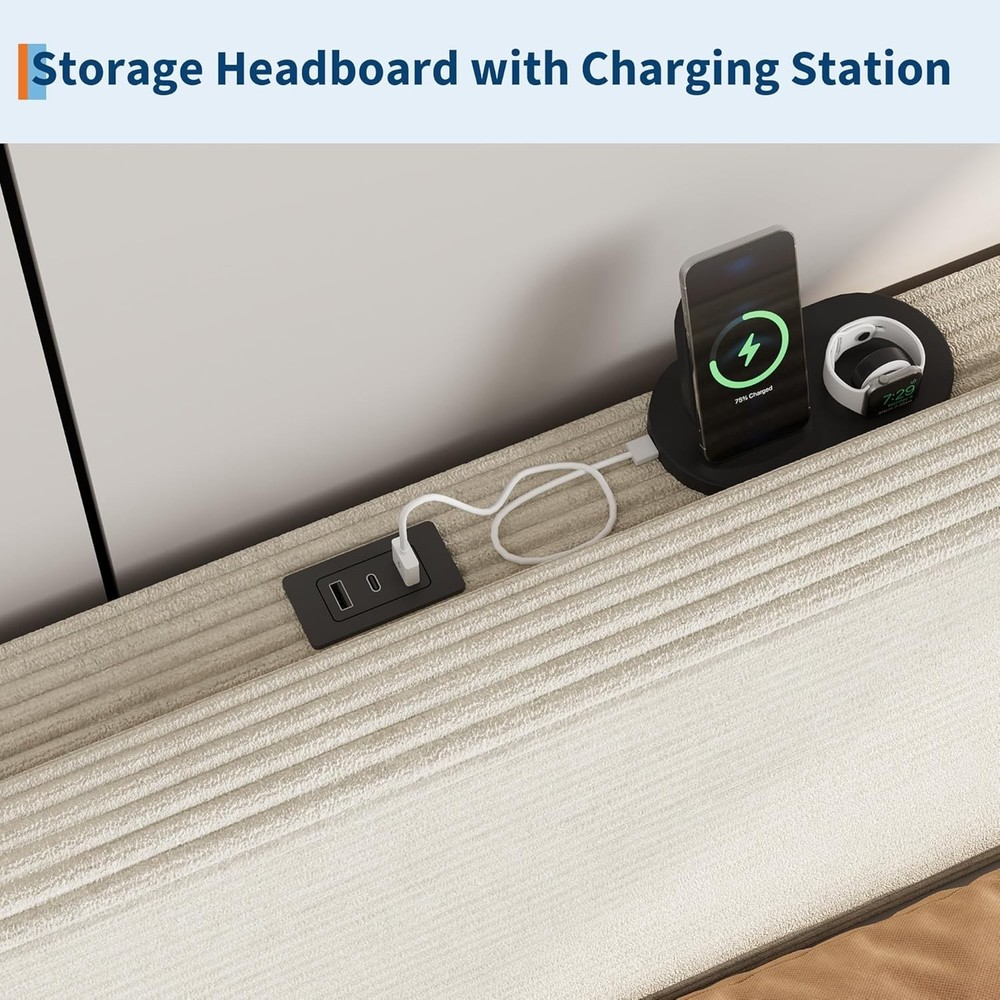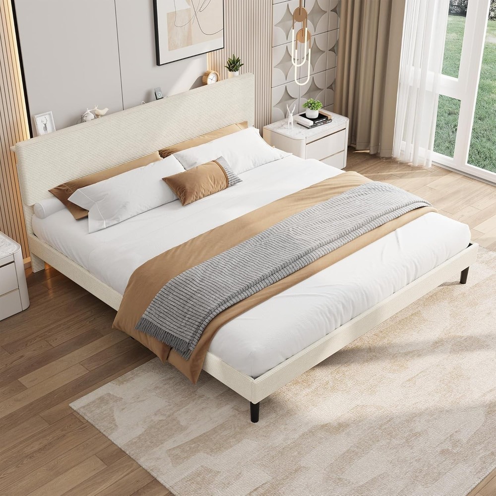 King Size Bed Frame, Storage Headboard with Charging Station, Solid and Stable, item description: 【Corduroy Upholstery Bed Fame】Upholstered in soft, high-quality corduroy fabric, this platform bed frame adds a touch of elegant style to any bedroom. The versatile beige color complements various decor themes, creating a cozy and contemporary atmosphere. Its plush surface ensures comfortable leaning and enhances the room's overall aesthetic appeal. 【Integrated USB Charging Station】This twin size bed frame features a built-in charging station with dual USB ports, allowing you to conveniently power your phones, tablets, and laptops right from your bedside. Say goodbye to cluttered cords and stay organized. 【Adjustable Headboard with Storage Shelf & Under-Bed Space】Maximize your bedroom storage with the versatile headboard design, which includes a handy shelf for keeping books, alarms, or decorative items within easy reach. The 6-inch clearance underneath the platform bed frame offers additional space for storing bins or boxes, making cleaning effortless and helping you maintain a tidy, clutter-free sleeping environment. 【Sturdy Wooden Slat Support – No Box Spring Needed】Engineered for durability and quiet performance, this upholstered platform bed frame is built with reinforced wooden slats that provide strong, reliable support for your mattress without the need for a box spring. Anti-slip strips and noise-free padding ensure solid construction and minimize movement, offering you a peaceful and restful night’s sleep for years to come.